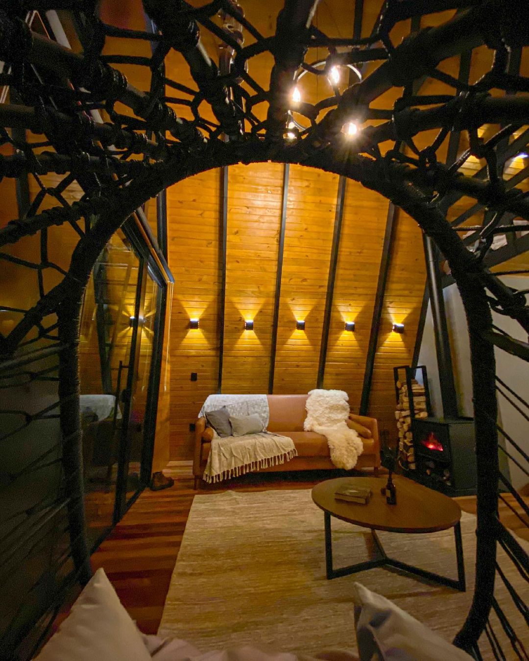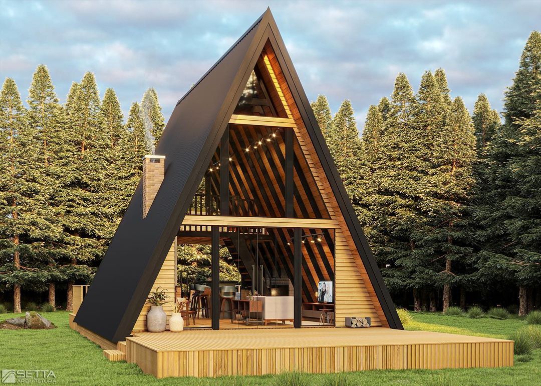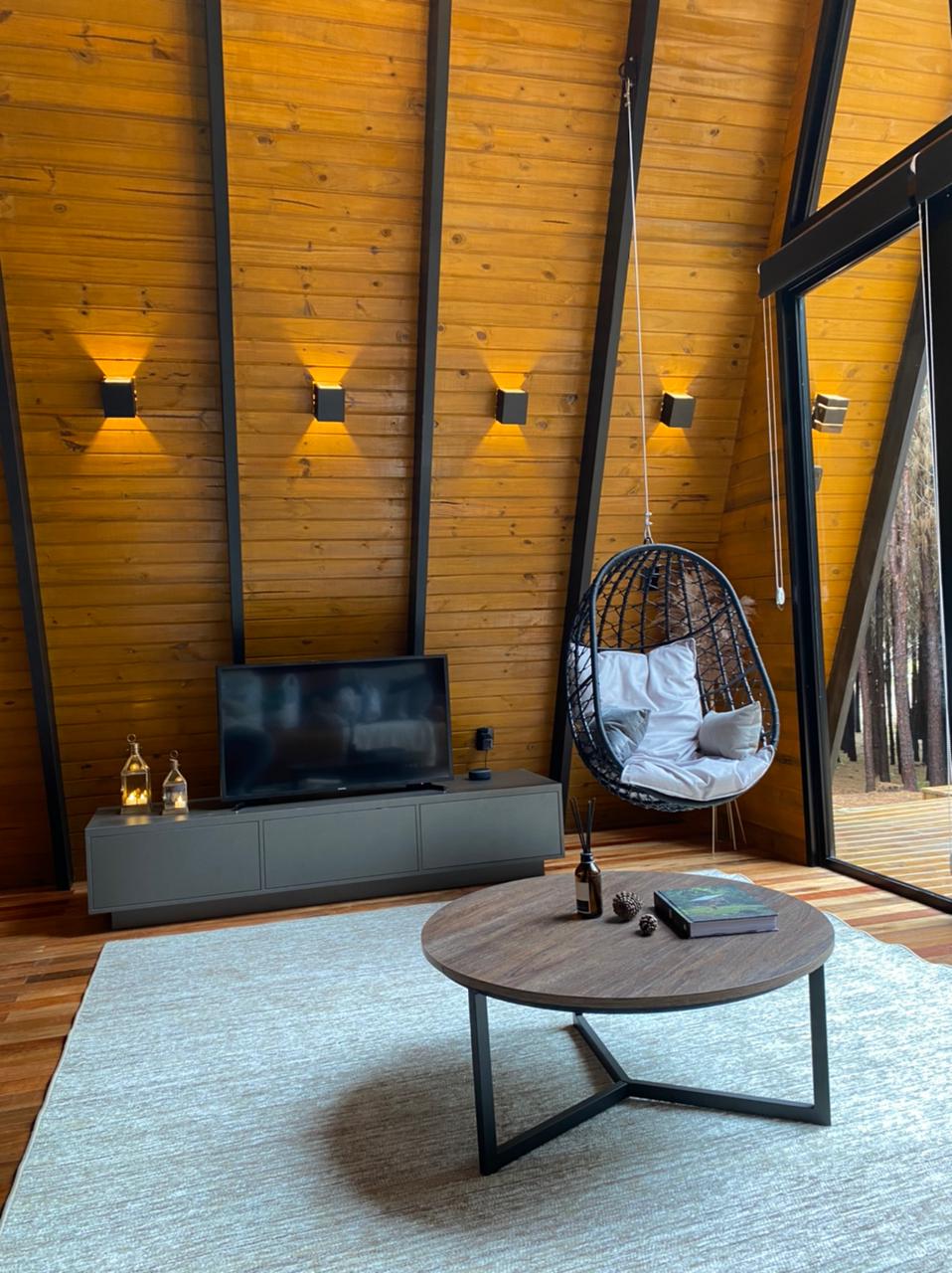 Com localização privilegiada, a cabana foi construída em um terreno privativo em meio uma floresta de pinus. O design em formato A-Frame, reforça o visual das referências e mantém o conceito da imersão na natureza.