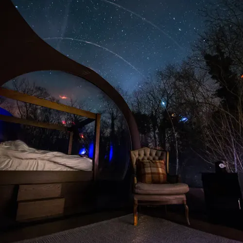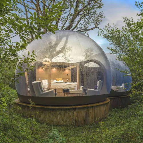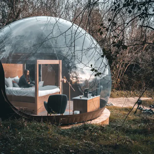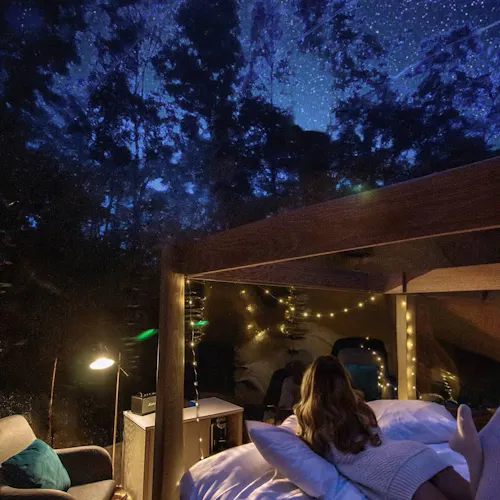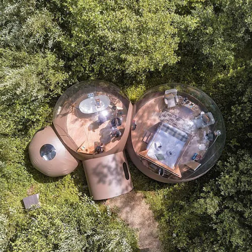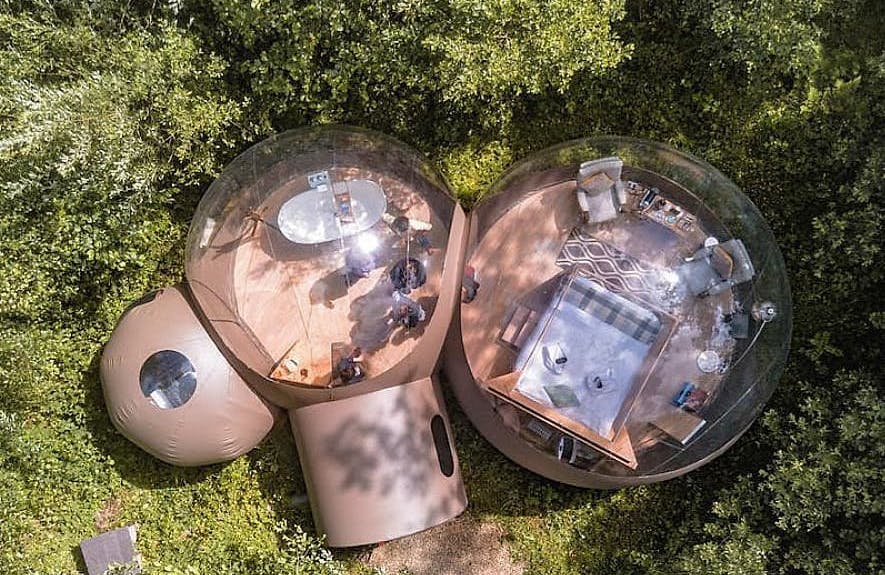 As bolhas estão escondidas na floresta privada da propriedade, são transparentes e oferecem um visual ininterrupto da natureza ao redor para que você possa mergulhar no ambiente dormir sob o céu.
