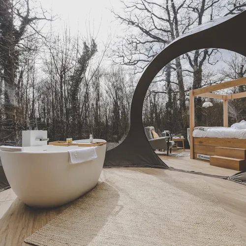 As bolhas premium oferecem interiores mais espaçosos e extra luxuosos, incluindo uma banheira vitoriana com vista para a floresta.