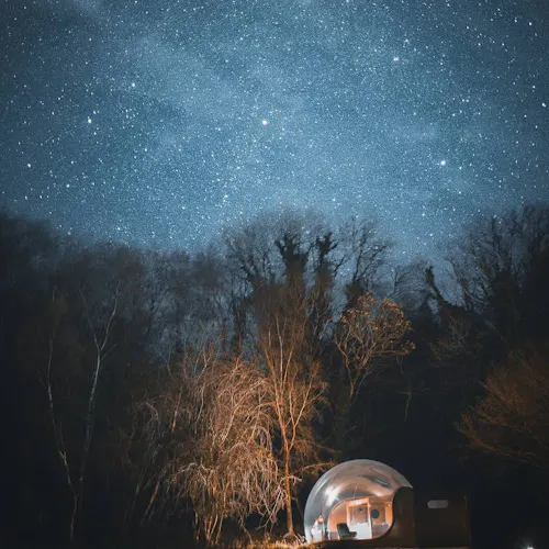 Uma cabana bolha dentro de uma floresta à beira rio pra dormir sob muitas estrelas