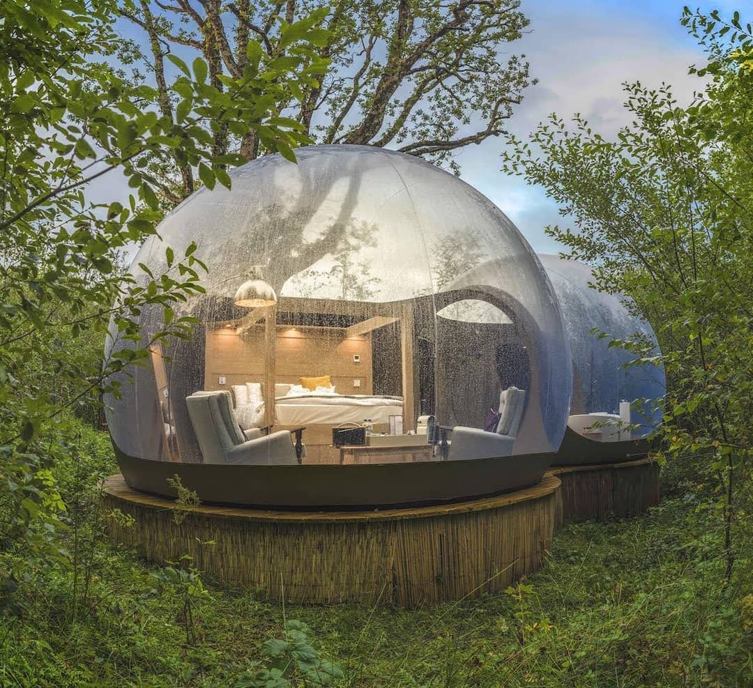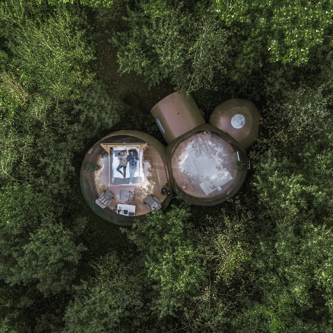 As bolhas estão escondidas na floresta privada da propriedade, são transparentes e oferecem um visual ininterrupto da natureza ao redor para que você possa mergulhar no ambiente dormir sob o céu.
