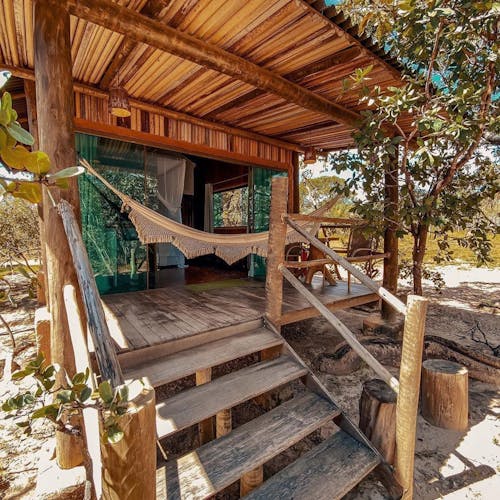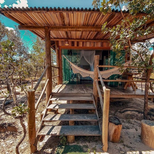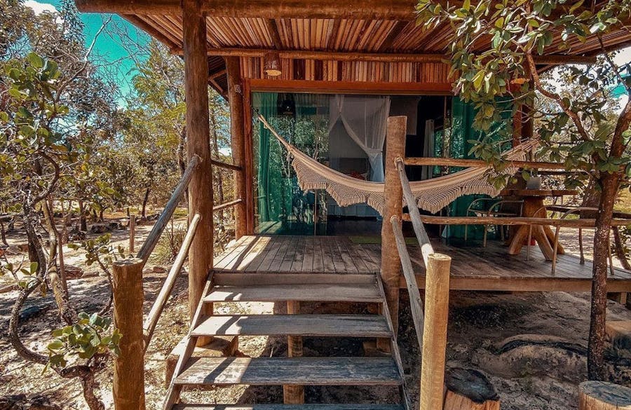 No portal de entrada do Parque Nacional da Chapada dos Veadeiros se encontra essa cabana. Ela é uma das opções de hospedagem da pousada Baguá.