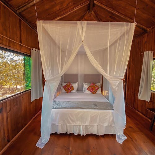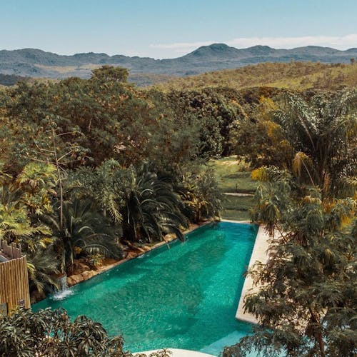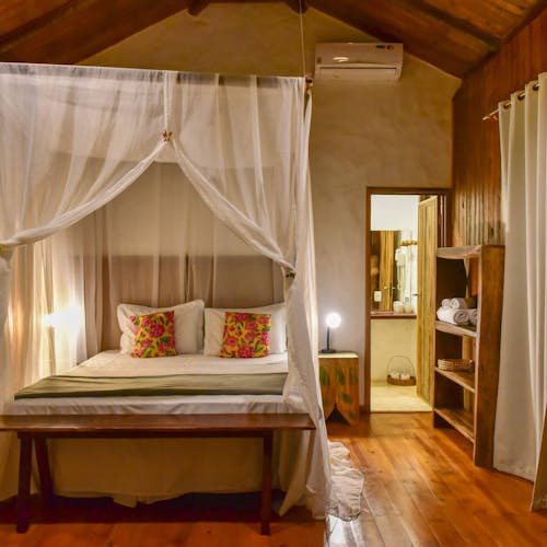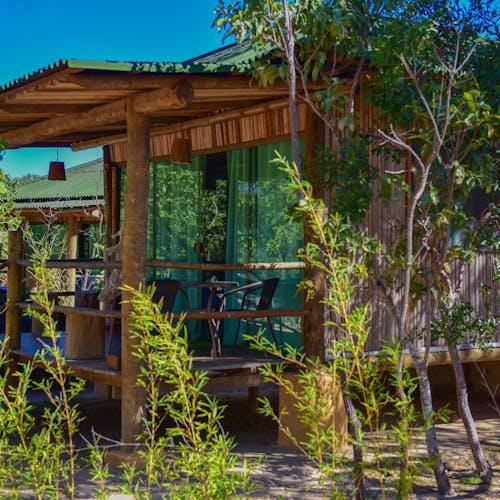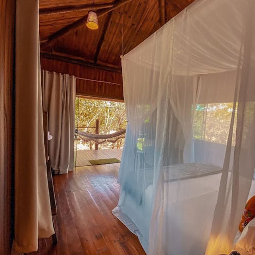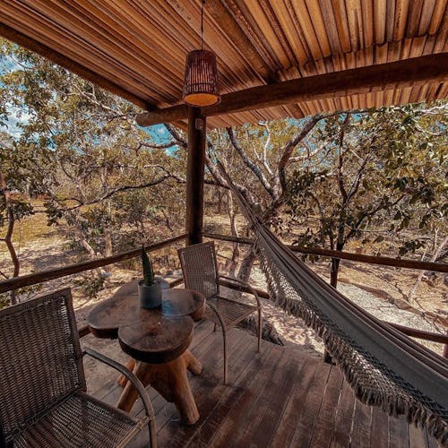 A Cabana Zazu e outras 2 são mais afastadas do centro da pousada (que tem apenas 7 bangalôs além das cabanas), dispostas em um terreno de cerrado nativo, deixando a experiência ainda mais interessante pela vegetação selvagem.