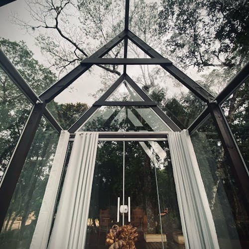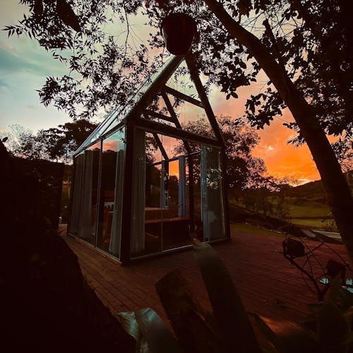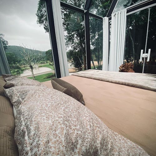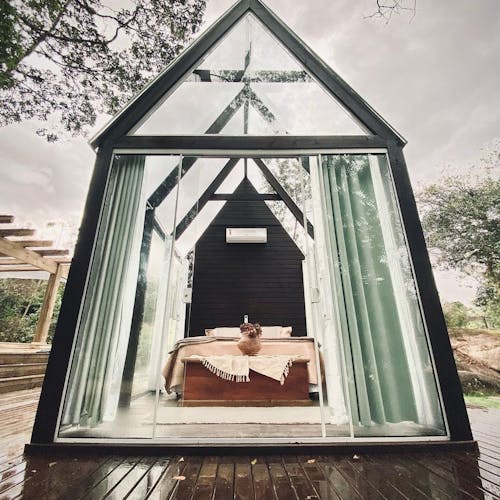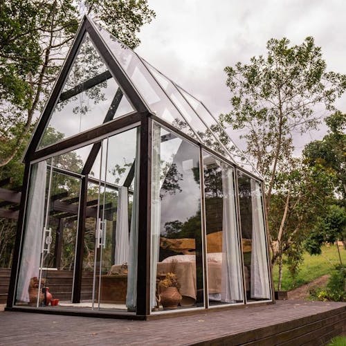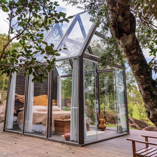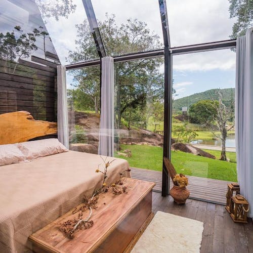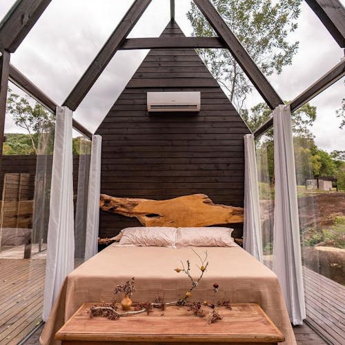 Traz uma opção de hospedagem diferente pra quem deseja se aventurar em um tipo de cabana novo: apenas uma cama dentro de uma cabin inteira de vidro!