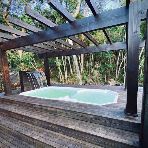 Já que dentro da cabana fica apenas a cama e alguns itens decorativos, o banheiro fica localizado do lado de fora, ao lado do espaço privativo de hidromassagem.