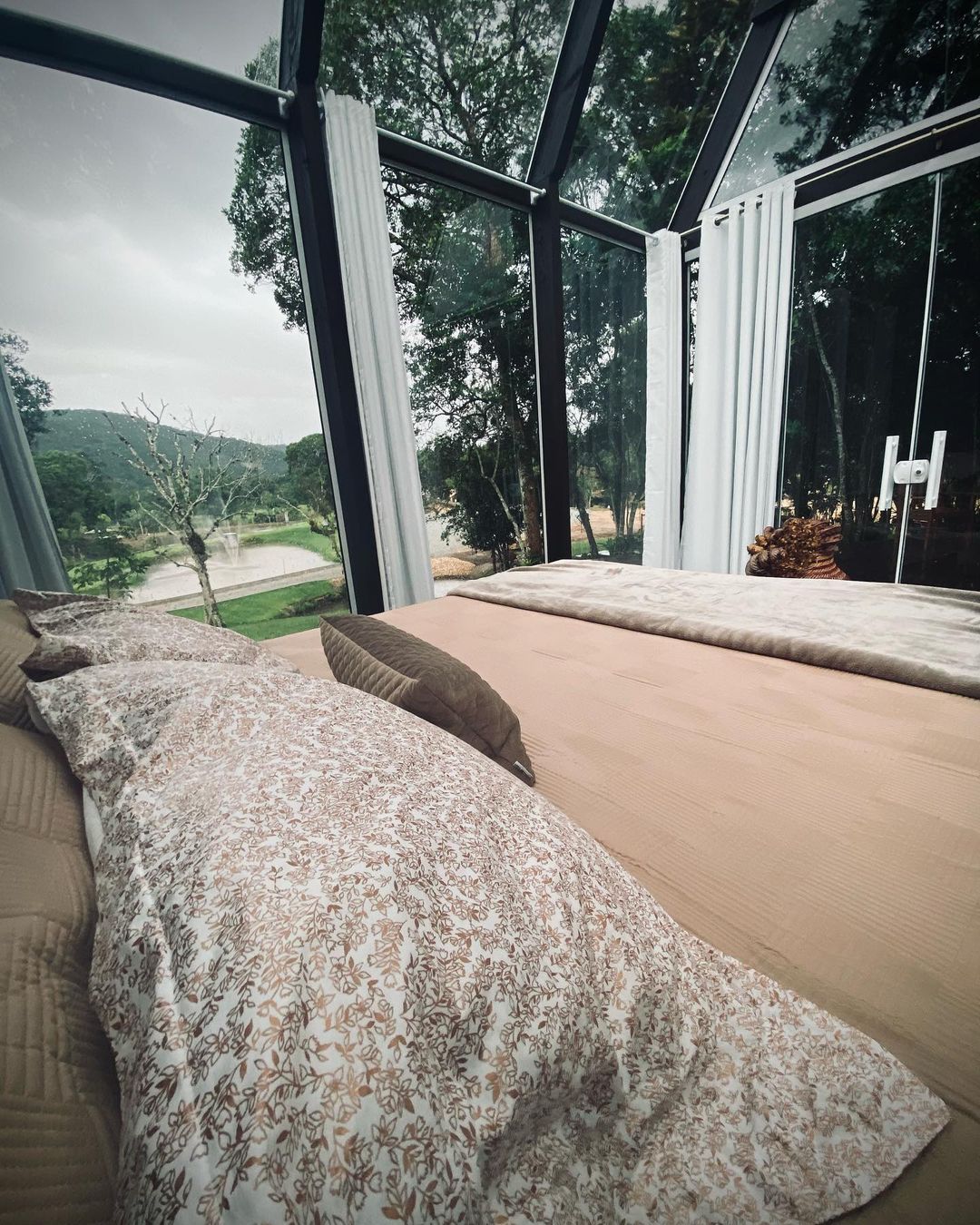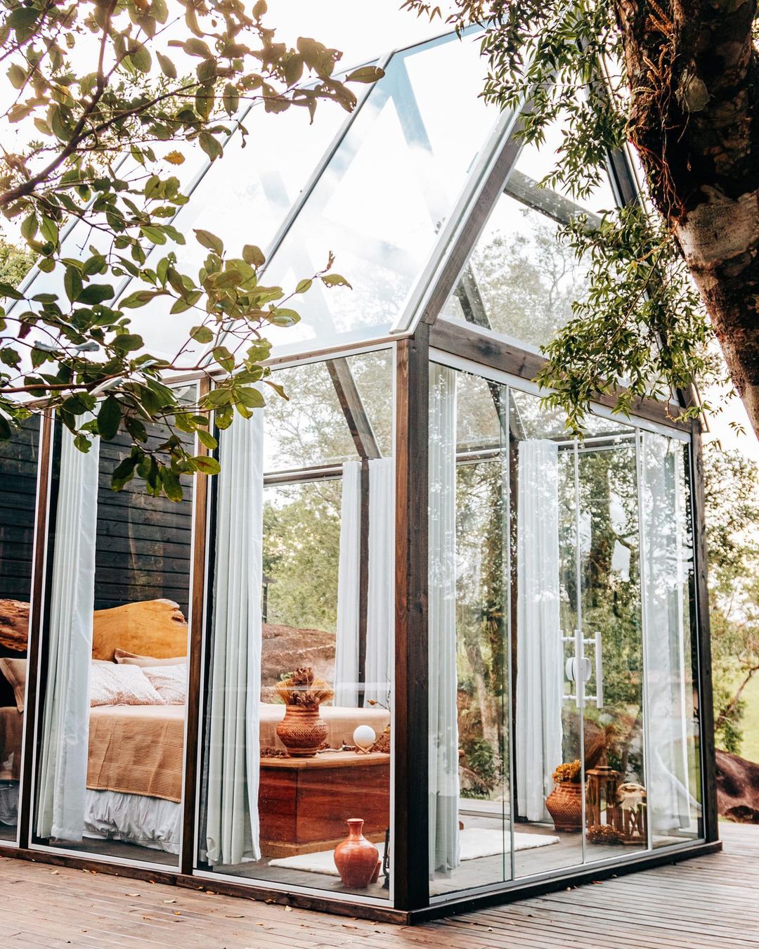Traz uma opção de hospedagem diferente pra quem deseja se aventurar em um tipo de cabana novo: apenas uma cama dentro de uma cabin inteira de vidro!