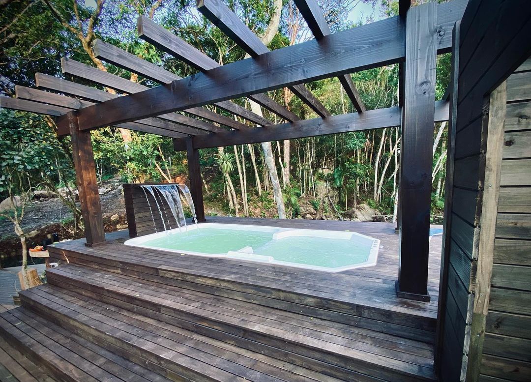 Já que dentro da cabana fica apenas a cama e alguns itens decorativos, o banheiro fica localizado do lado de fora, ao lado do espaço privativo de hidromassagem.