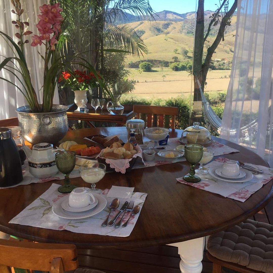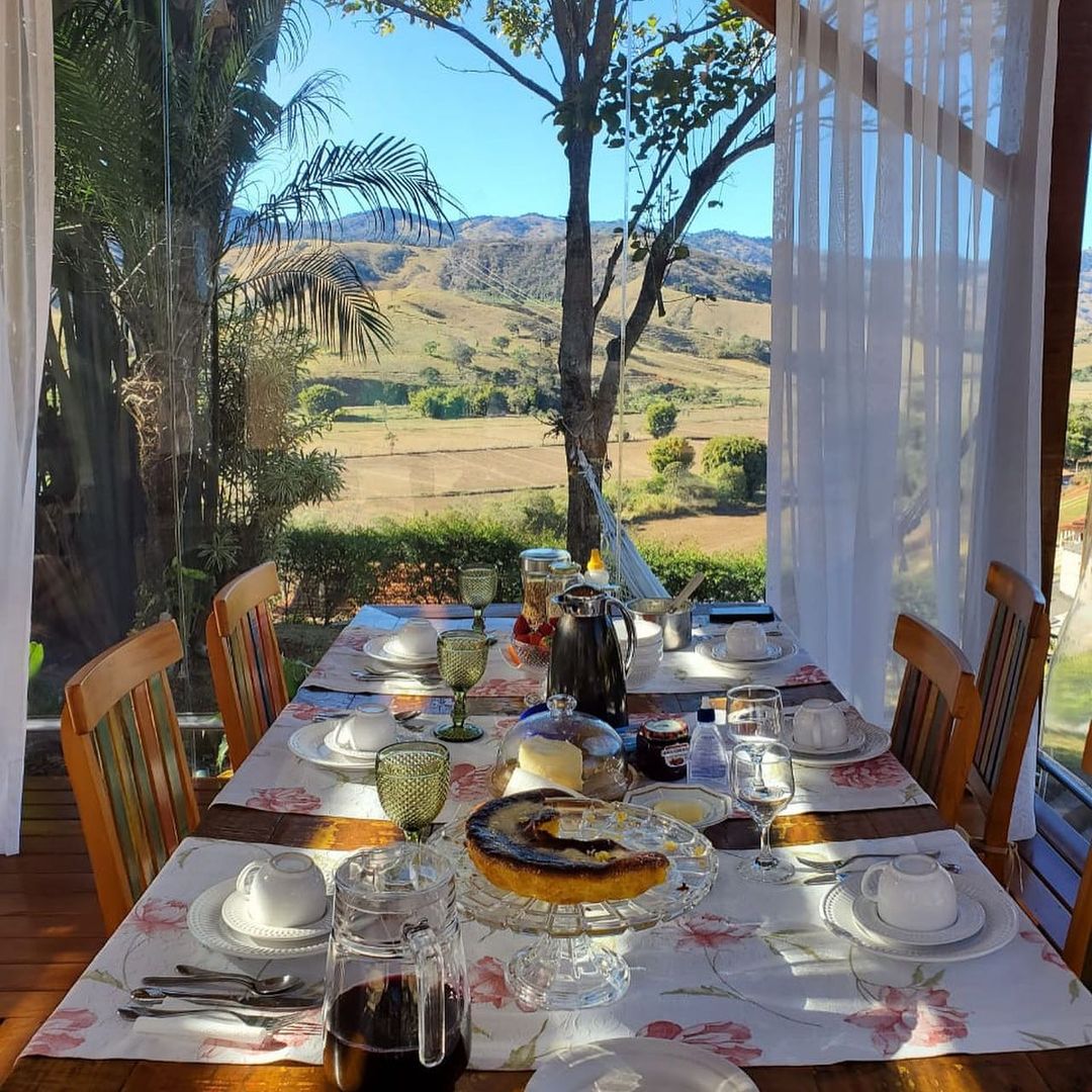 O café da manhã caseiro (com opções vegetarianas e veganas também) é um dos diferenciais da cabana e está incluso na diária. O próprio local já oferece aos visitantes tudo pronto, em mesas de madeira com vista para a Serra.