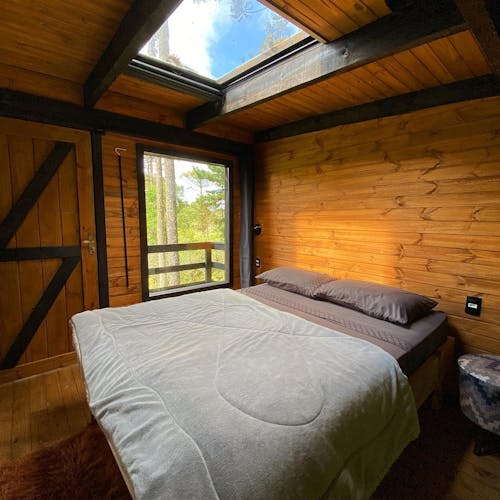 Duas camas de casal no mezanino da cabana e um teto de vidro: conheça a Mountain Cabin - localizada no espaço privado de experiências de hospedagem do Refuge Green Valley em Urubici.