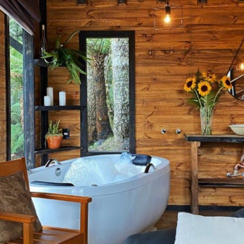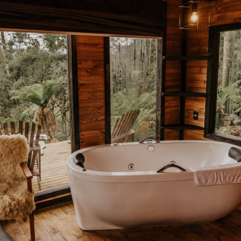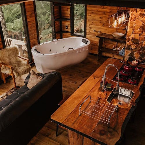 A hospedagem é uma ótima escolha para casais que procuram privacidade em meio a natureza ou família e amigos que queiram aproveitar dias mais remotos em um lugar aconchegante. A cabana é completa e inclusive conta com banheira que tem vista para a floresta nativa 🌳.