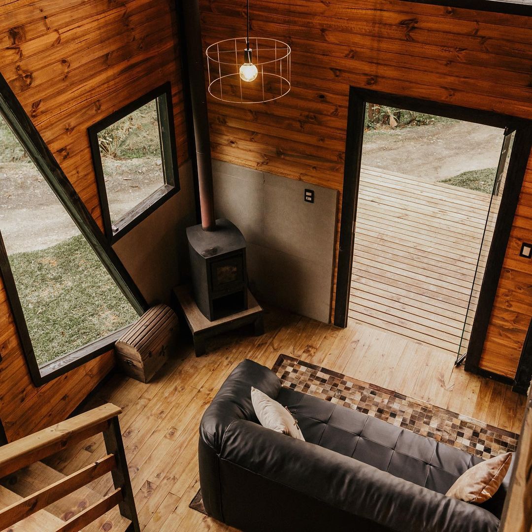 Uma cabana de dois andares moderna e estilosa, no melhor estilo american cabin, cercada de mata e animais nativos.