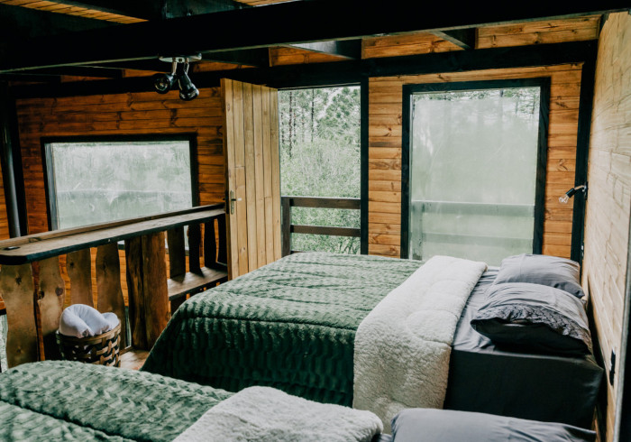 Duas camas de casal no mezanino da cabana e um teto de vidro: conheça a Mountain Cabin - localizada no espaço privado de experiências de hospedagem do Refuge Green Valley em Urubici.