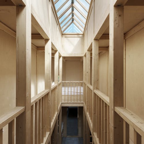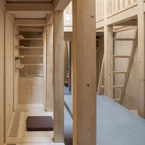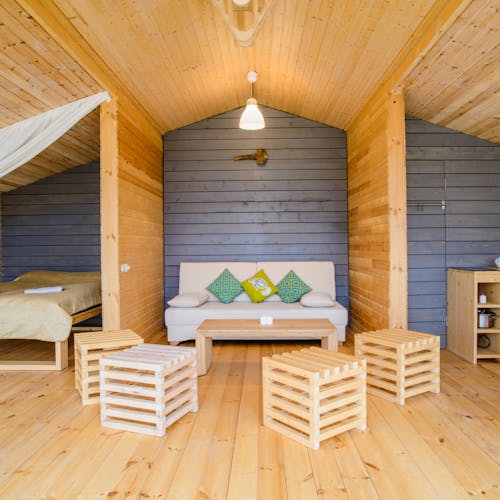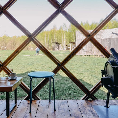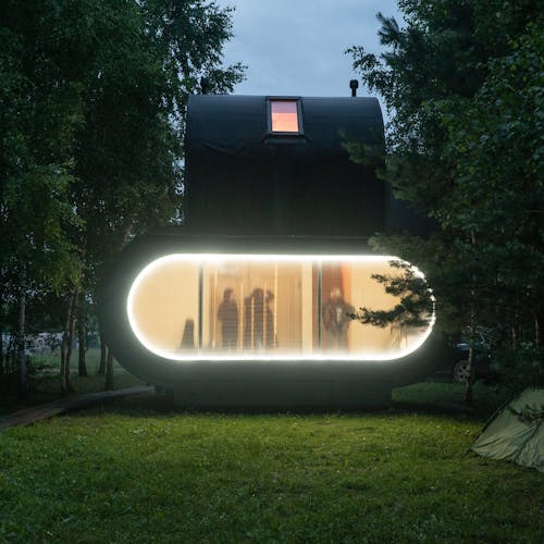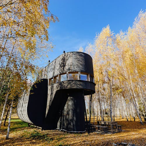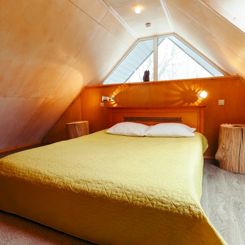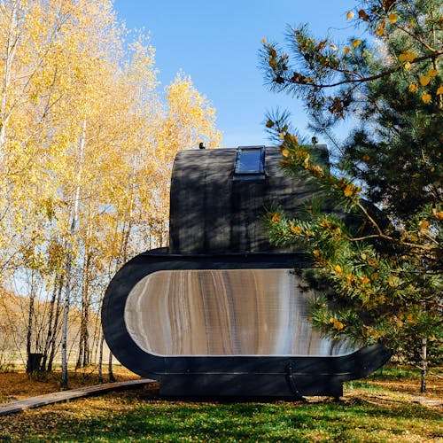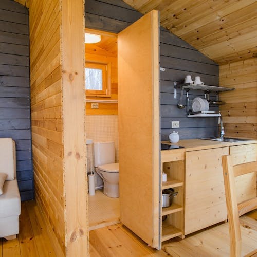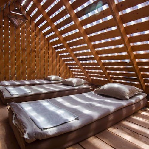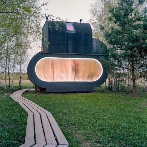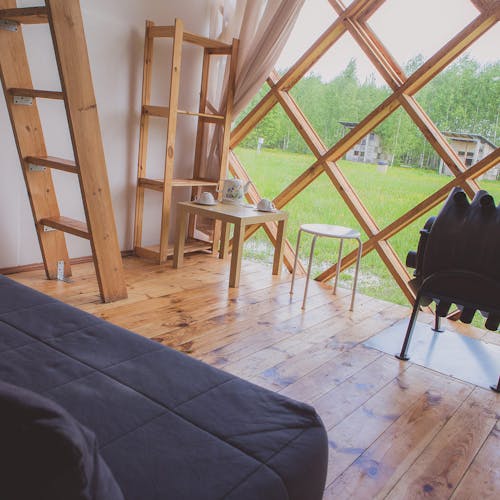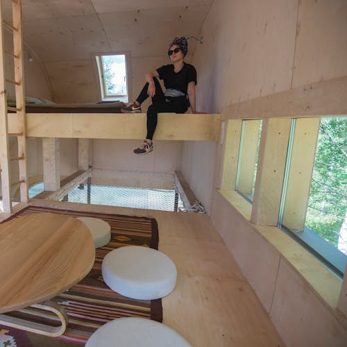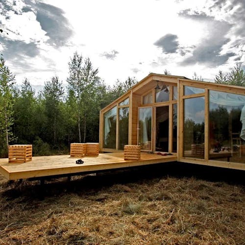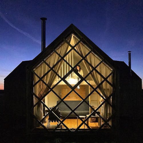 Desenhado por Mel Space, vencedor do prêmio ARXIWOOD. Fabricadas em madeira, forradas com tábuas ásperas por fora e brancas por dentro, com isolamento térmico. O quarto fica no segundo andar e uma parede da cabana é transparente. Adequada para duas, três ou 4 pessoas (duas camas extras podem ser instaladas e há berços disponíveis). Chuveiro e toilet estão localizados nas proximidades.