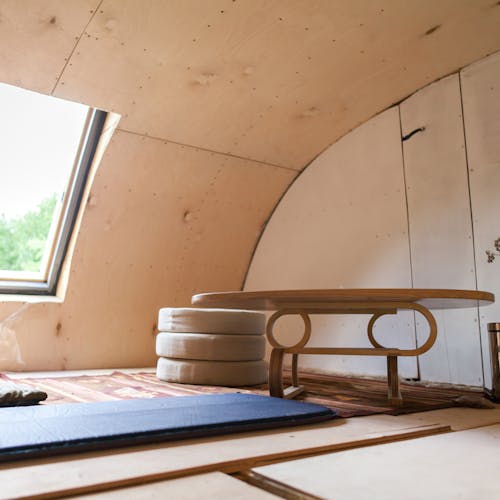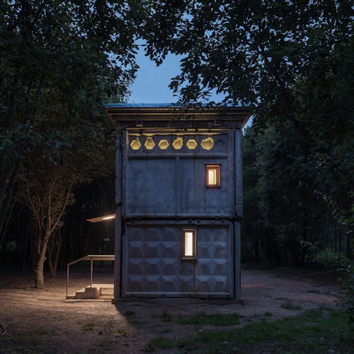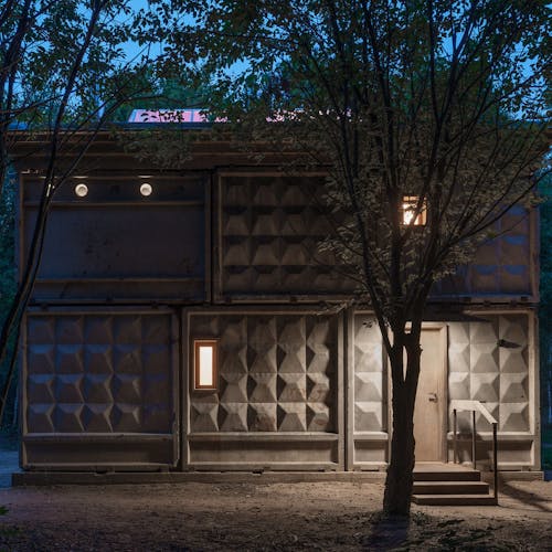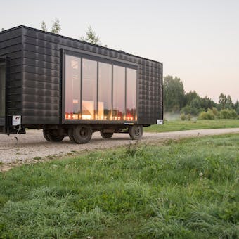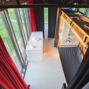 A entrada lateral dessa acomodação inspirada em um ônibus/trailer é decorada com vitrais, a parte oposta é sólida com todas as áreas funcionais necessárias localizadas no interior. Um sistema de tecidos e cortinas, com iluminação especial pode transformar a unidade residencial, deixando um ambiente quase que artístico, como uma casa móvel sobre rodas para o elenco de um circo itinerante. Com cores pretas intensas mesclando com doses minimalistas internas, o design predomina nesse espaço interativo de hospedagem.