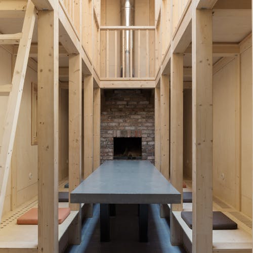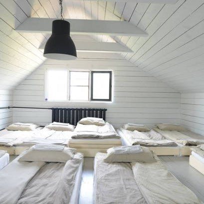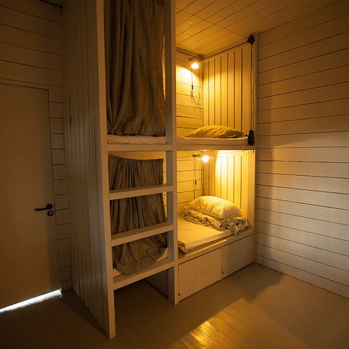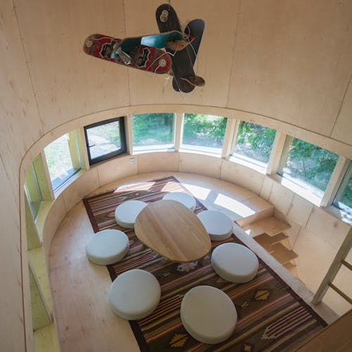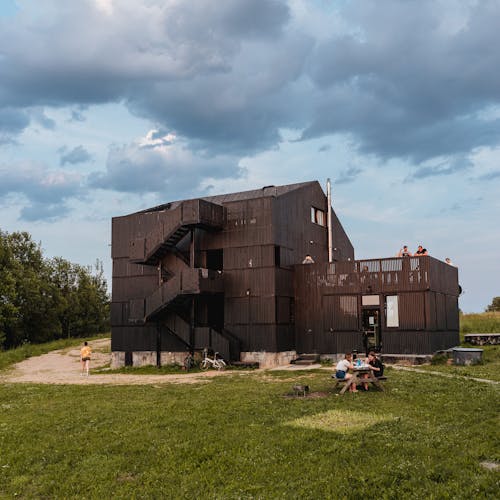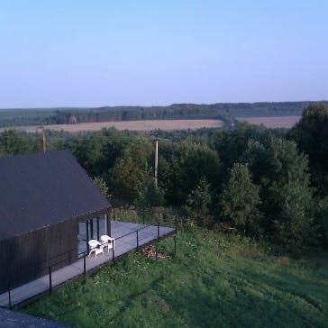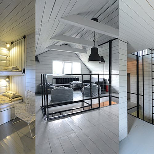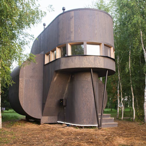 Praticamente uma obra de arte e ao mesmo tempo um albergue localizado no ponto mais alto do parque com uma vista incrível. Este é o melhor lugar para ficar em Nikola-Lenivets se estiver em um grande grupo de pessoas. Faz calor no inverno e é fresco no verão. O sótão espaçoso pode ser convertido de uma área de estar ou em uma área de trabalho. Existe um bar que lhe servirá sempre café e pequeno-almoço (aberto de quinta a domingo). Cada quarto possui uma beliche (colchões no sótão), cabide, gaveta para objetos de uso pessoal, tomadas e rede wi-fi. O segundo andar tem acesso a uma grande varanda e o terceiro andar a um terraço. Uma bela vista das colinas, da floresta e do objeto de arte Bobur. O albergue foi projetado em 2013 pelo estúdio de arquitetura ARCHPOLE.