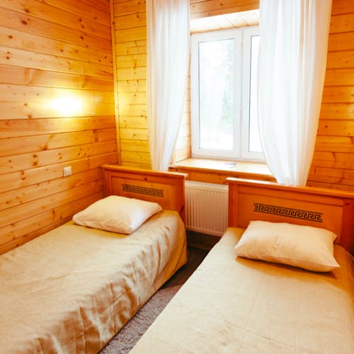 Quarto na pousada Florensky em Koltsovo Duas casas aquecidas com vários quartos individuais para uma, duas, três ou quatro pessoas, com ou sem banheiro. Camas extras são possíveis em todos os quartos (exceto econômico, quarto duplo standard e suíte família). As casas têm wi-fi e lanchonete ao lado de uma das casas onde é servido o café da manhã (incluído no preço). Temporada: todo o ano
