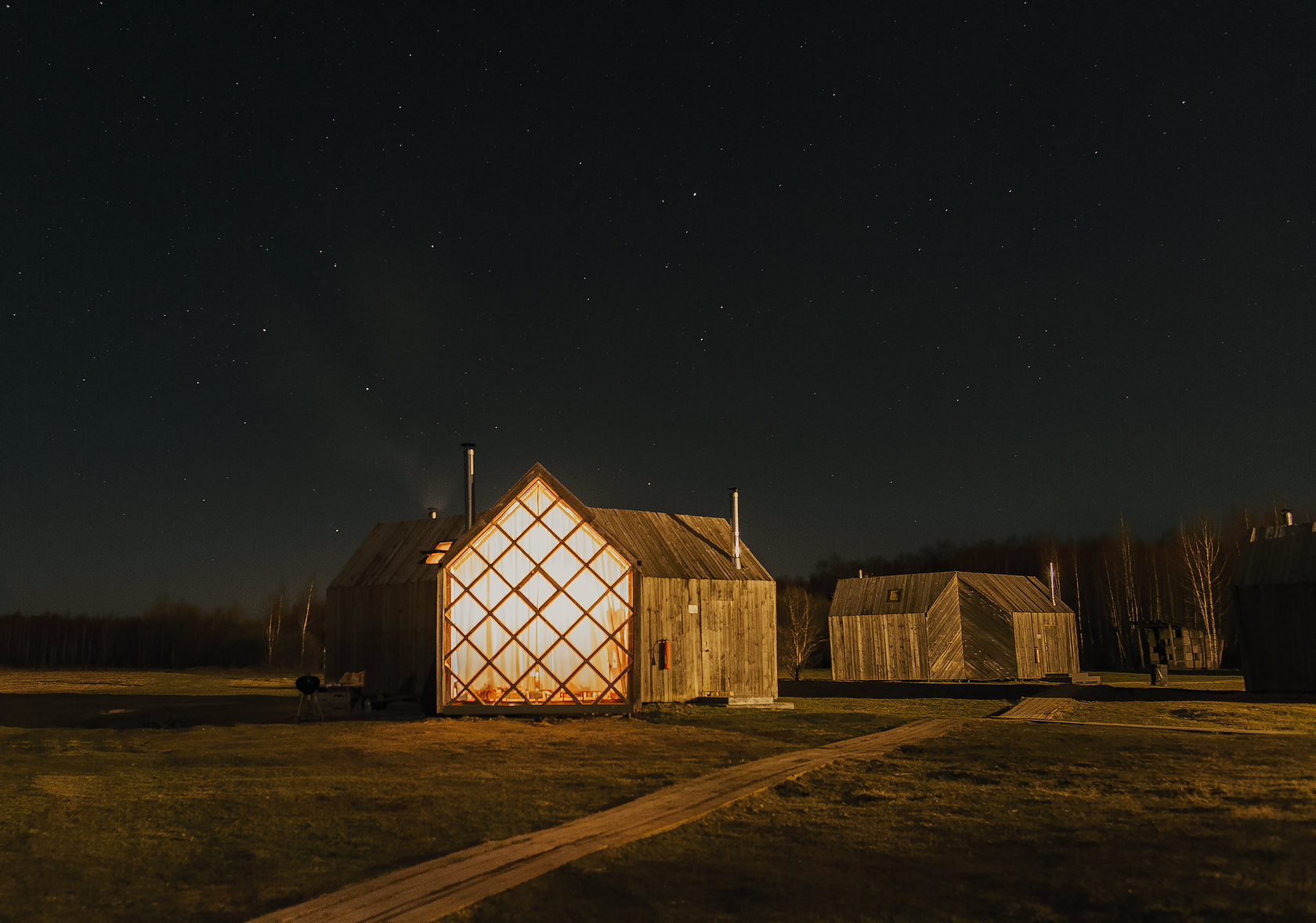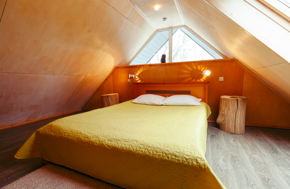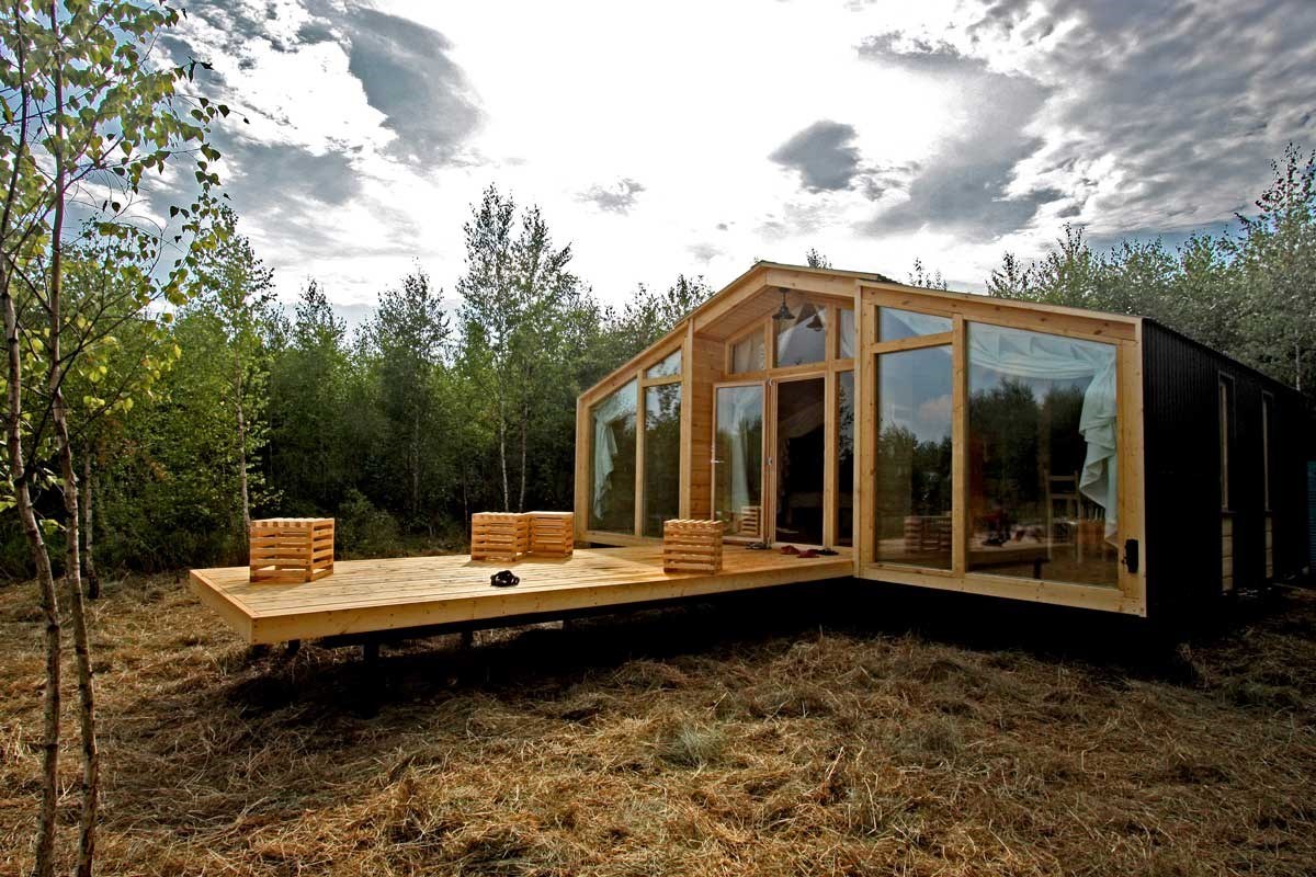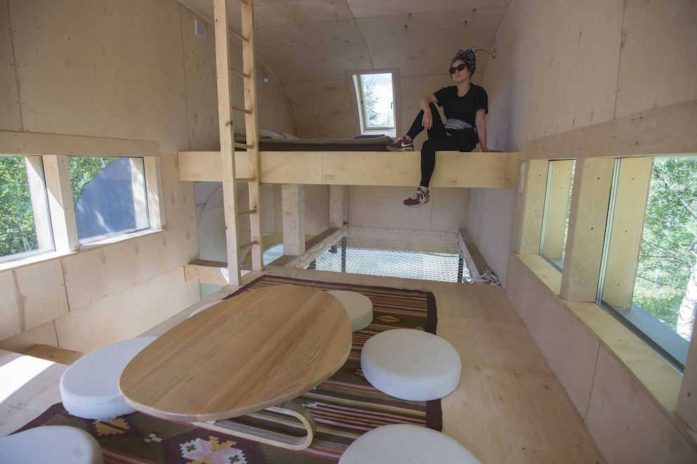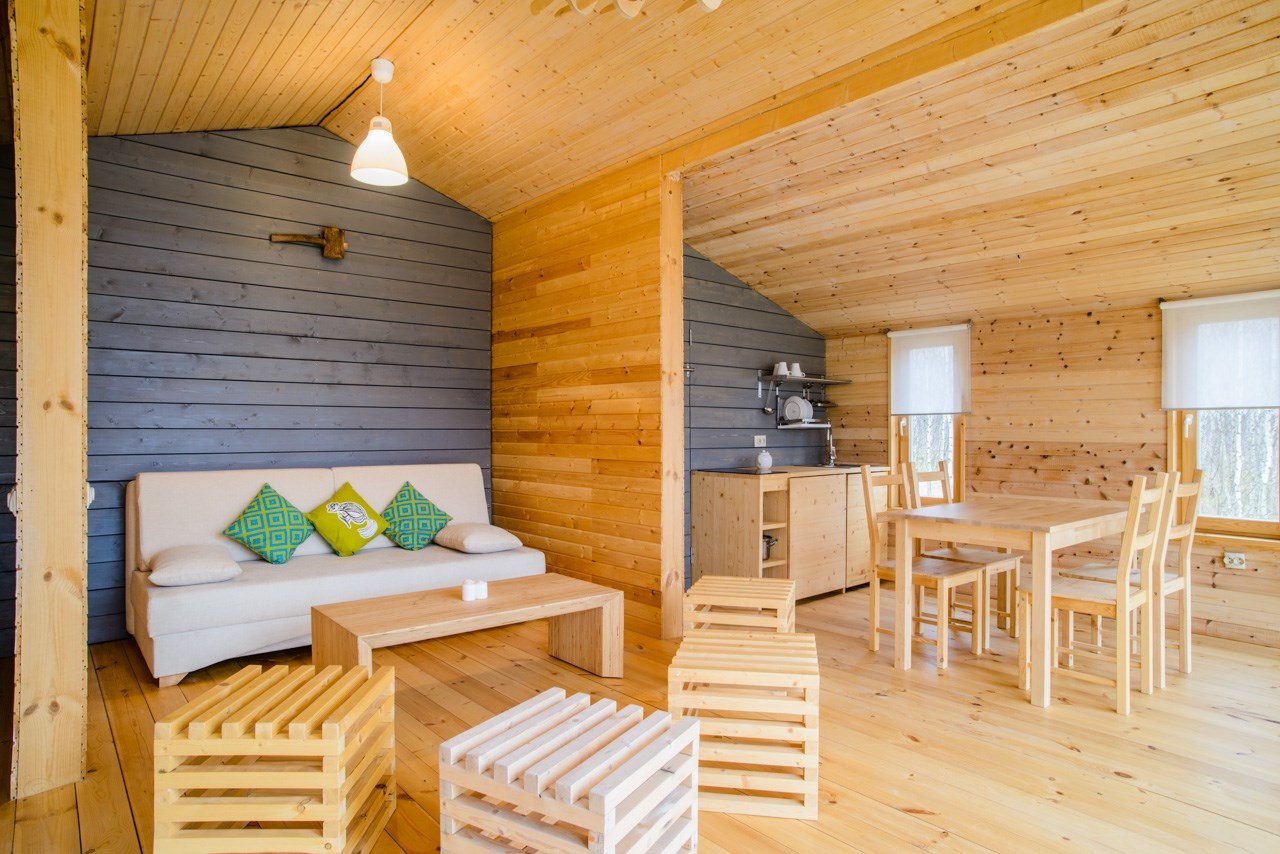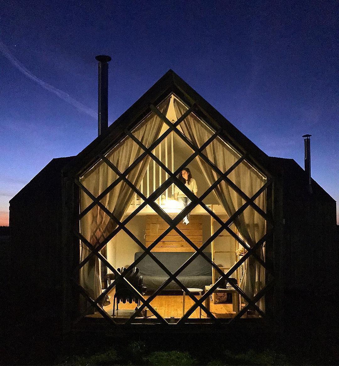 Desenhado por Mel Space, vencedor do prêmio ARXIWOOD. Fabricadas em madeira, forradas com tábuas ásperas por fora e brancas por dentro, com isolamento térmico. O quarto fica no segundo andar e uma parede da cabana é transparente. Adequada para duas, três ou 4 pessoas (duas camas extras podem ser instaladas e há berços disponíveis). Chuveiro e toilet estão localizados nas proximidades.