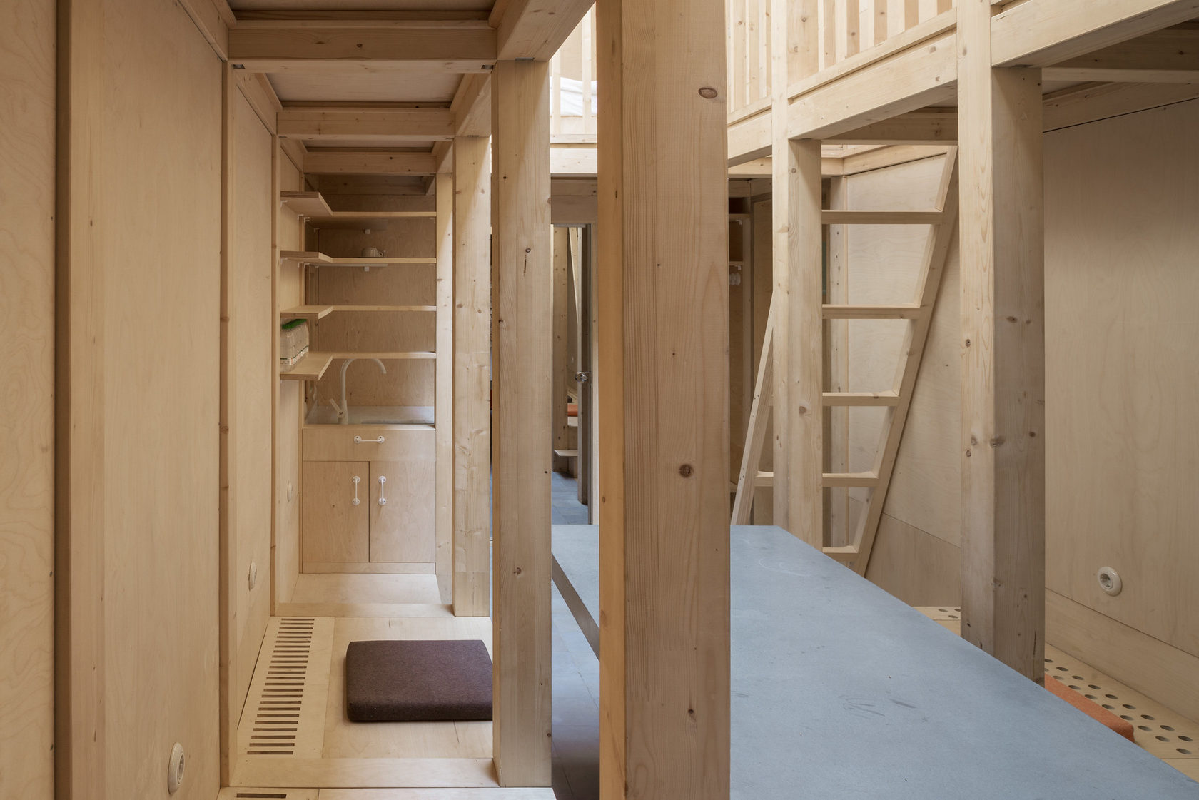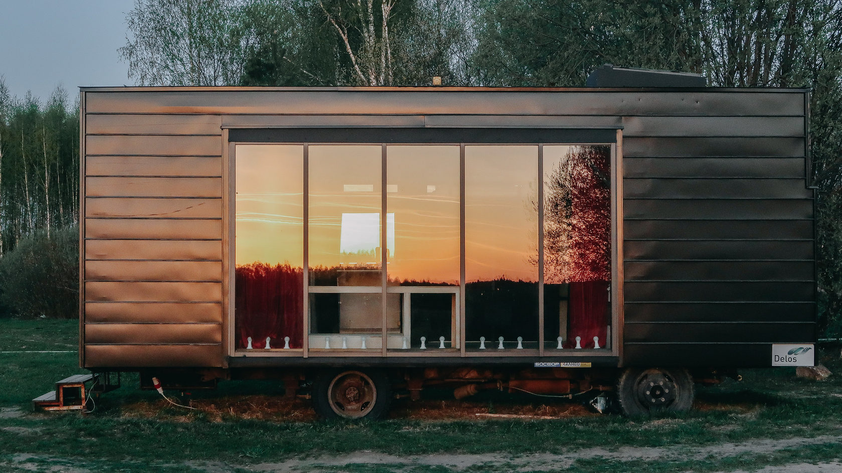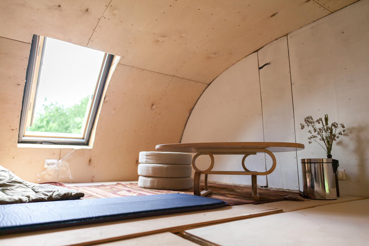 A entrada lateral dessa acomodação inspirada em um ônibus/trailer é decorada com vitrais, a parte oposta é sólida com todas as áreas funcionais necessárias localizadas no interior. Um sistema de tecidos e cortinas, com iluminação especial pode transformar a unidade residencial, deixando um ambiente quase que artístico, como uma casa móvel sobre rodas para o elenco de um circo itinerante. Com cores pretas intensas mesclando com doses minimalistas internas, o design predomina nesse espaço interativo de hospedagem.