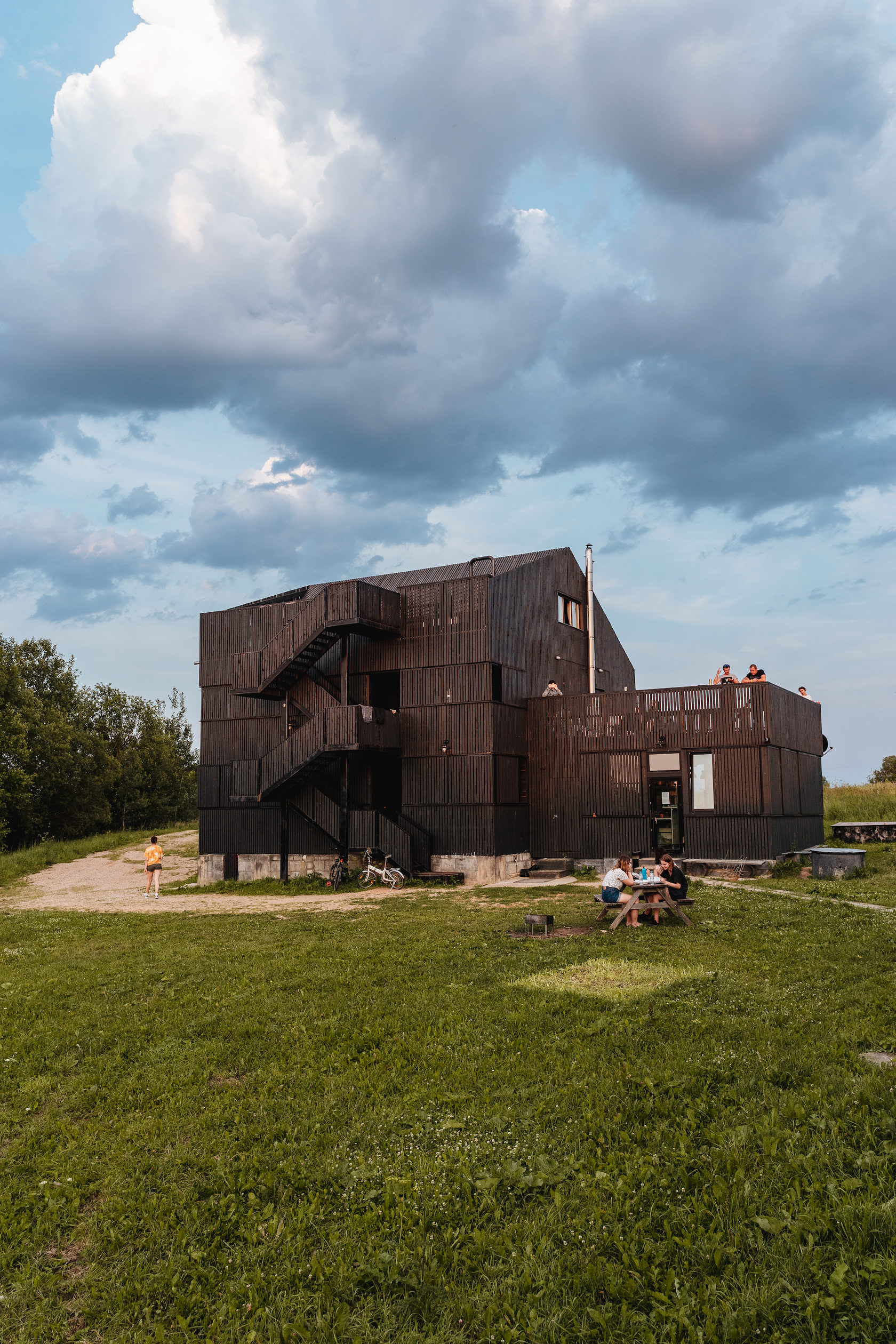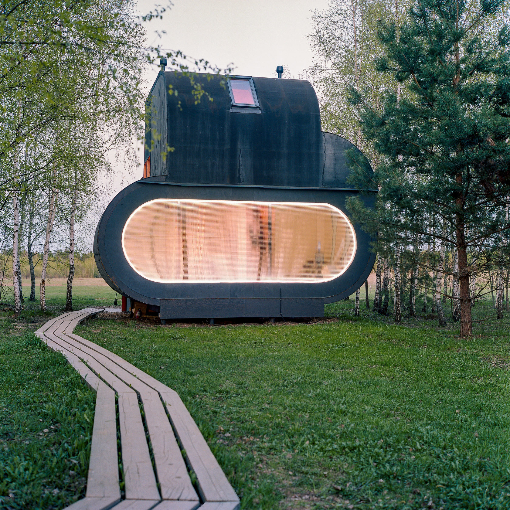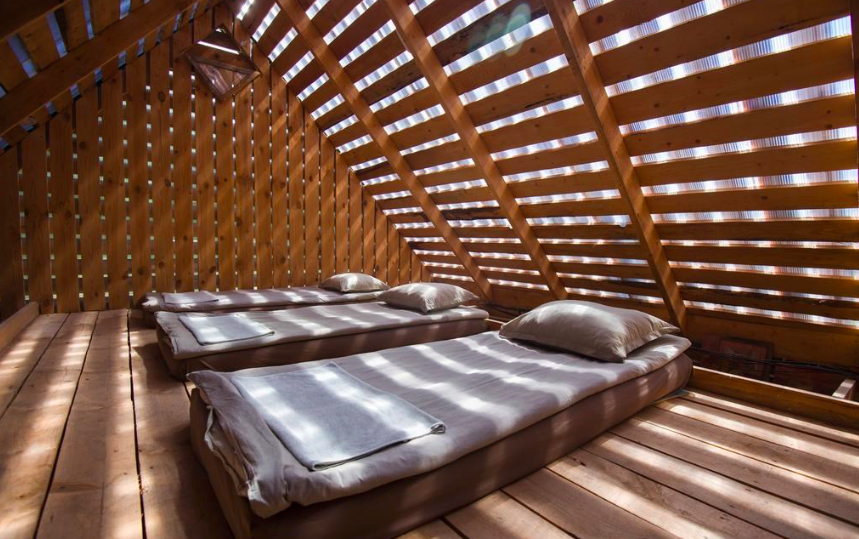 Praticamente uma obra de arte e ao mesmo tempo um albergue localizado no ponto mais alto do parque com uma vista incrível. Este é o melhor lugar para ficar em Nikola-Lenivets se estiver em um grande grupo de pessoas. Faz calor no inverno e é fresco no verão. O sótão espaçoso pode ser convertido de uma área de estar ou em uma área de trabalho. Existe um bar que lhe servirá sempre café e pequeno-almoço (aberto de quinta a domingo). Cada quarto possui uma beliche (colchões no sótão), cabide, gaveta para objetos de uso pessoal, tomadas e rede wi-fi. O segundo andar tem acesso a uma grande varanda e o terceiro andar a um terraço. Uma bela vista das colinas, da floresta e do objeto de arte Bobur. O albergue foi projetado em 2013 pelo estúdio de arquitetura ARCHPOLE.