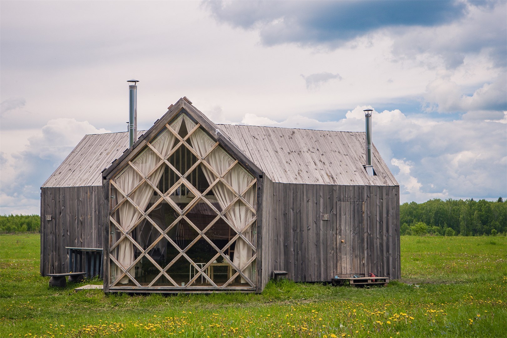 Localização: na entrada de Nikola-Lenivets, em frente à recepção. Cinco minutos de caminhada até o acampamento ecológico Zvizhanka, 4 km até o café de verão e fazenda Ugra