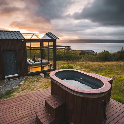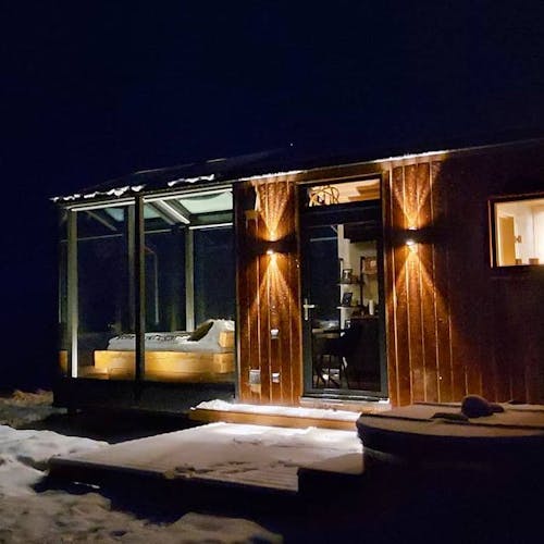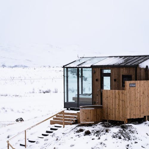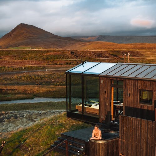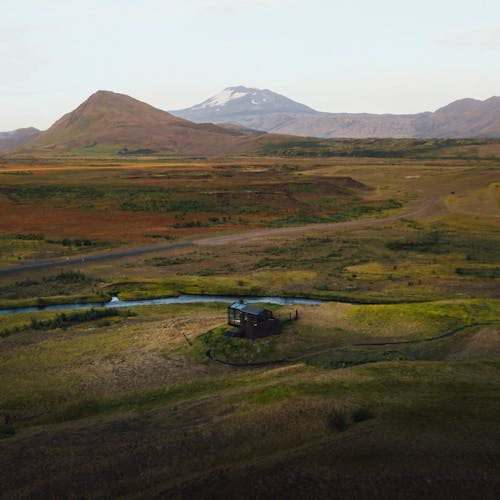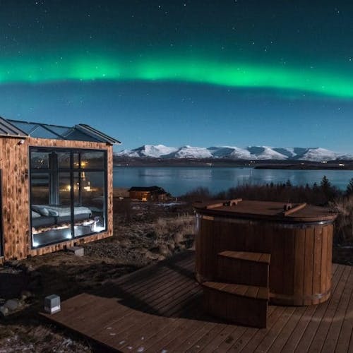 As cabanas são equipadas com jacuzzi externa, terraço, banheiro privativo e tem café da manhã incluso. Com vista direta para o vulcão Hekla, montanhas e um rio.
