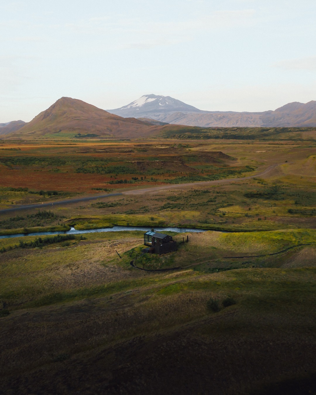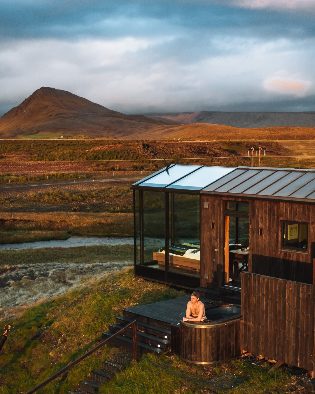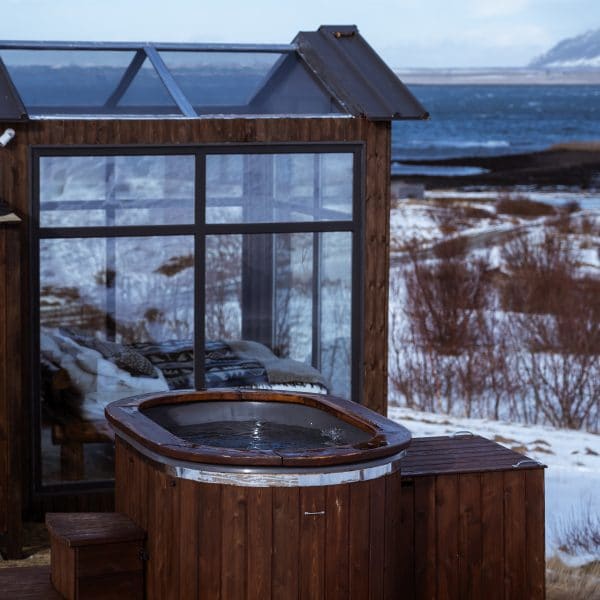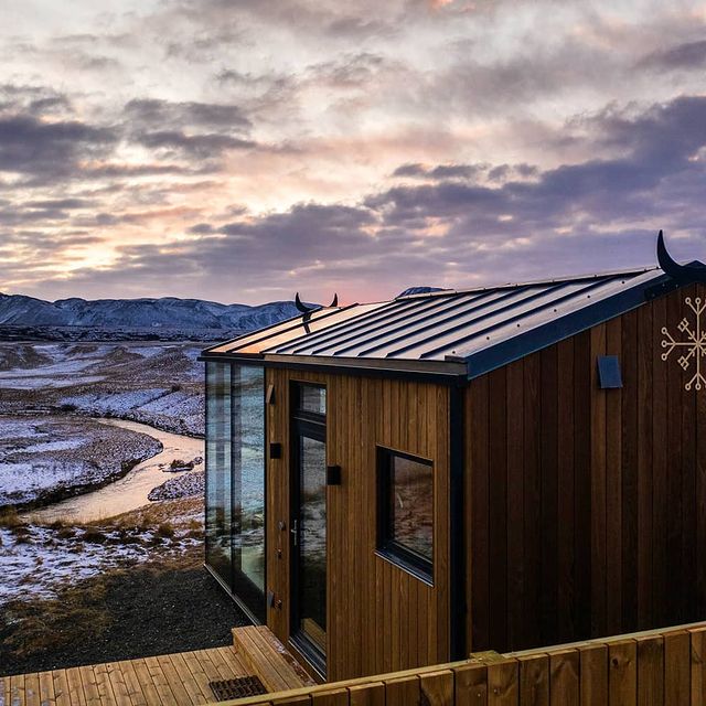 As cabanas são equipadas com jacuzzi externa, terraço, banheiro privativo e tem café da manhã incluso. Com vista direta para o vulcão Hekla, montanhas e um rio.