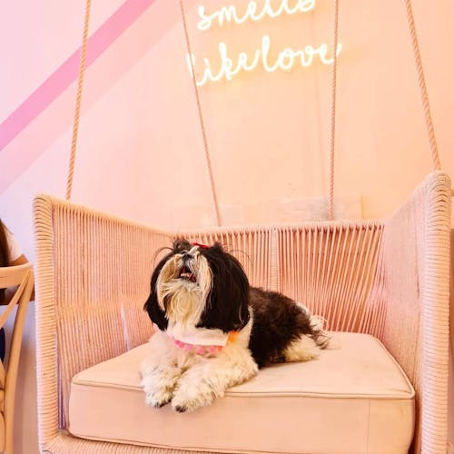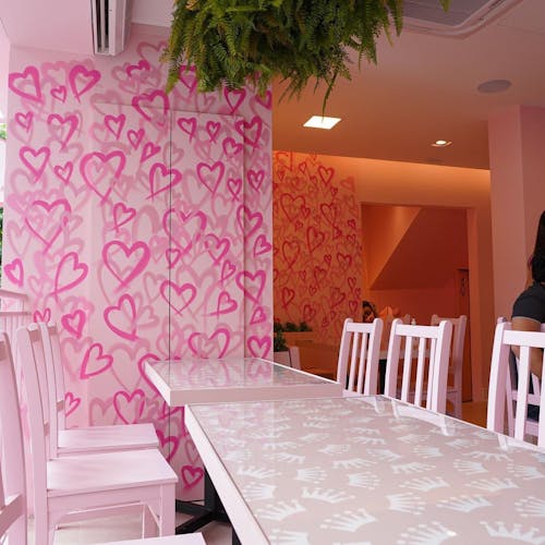 A decoração é repleta de espaços feitos justamente para que os clientes façam uma parada estratégica para as fotos, com cenografia toda pintada em cor de rosa #óbvio, neons e até balanço.