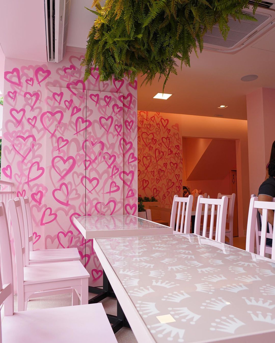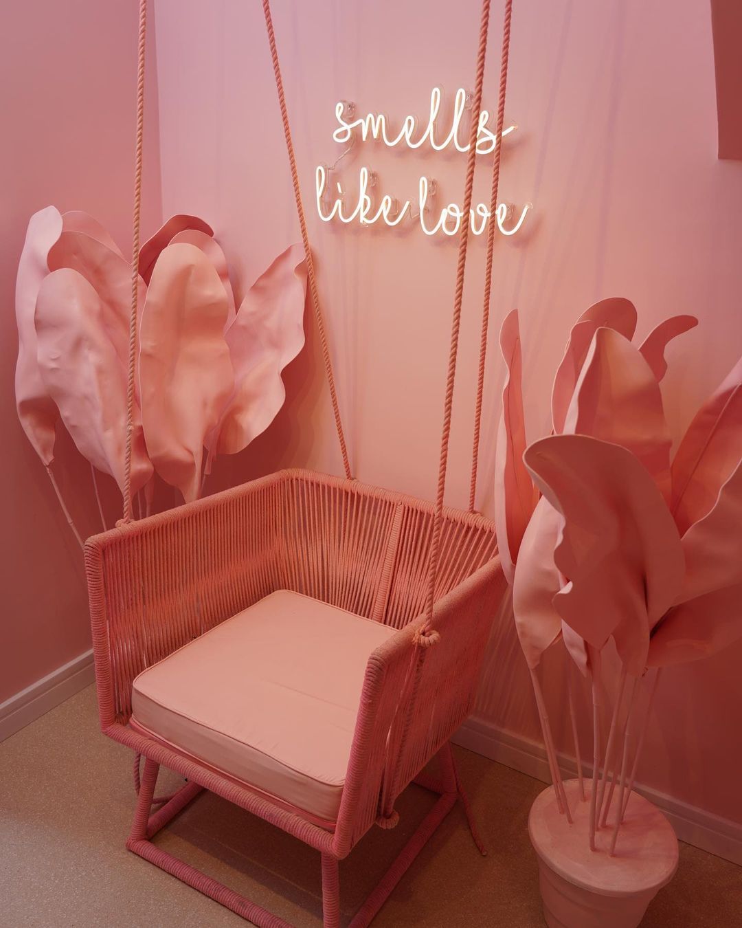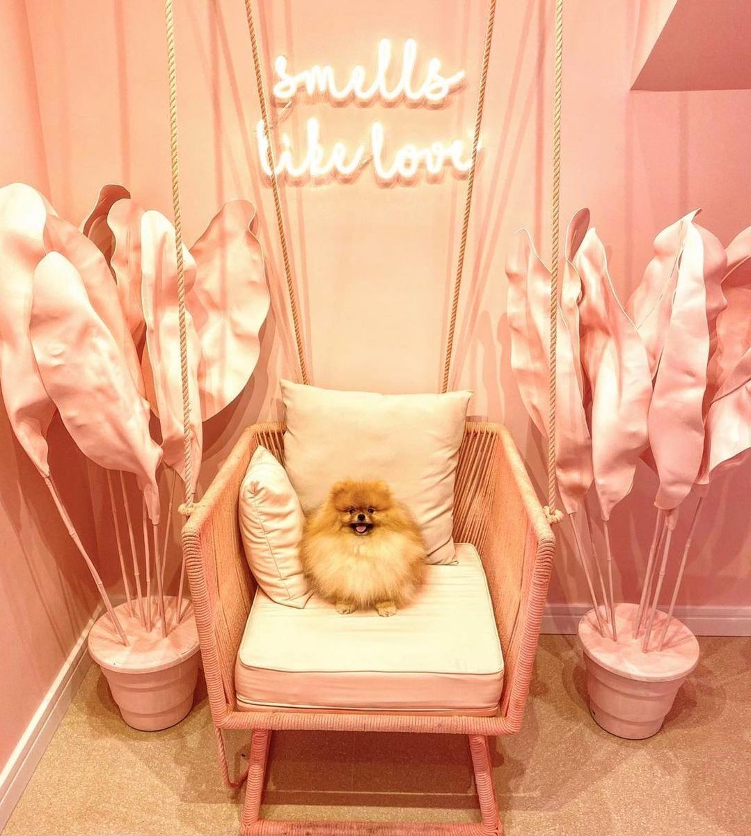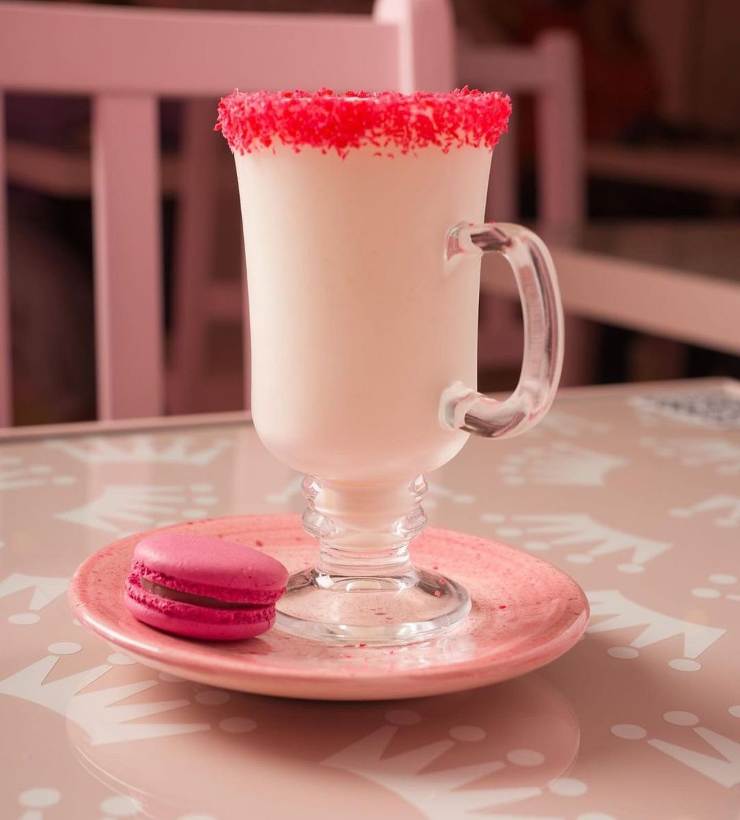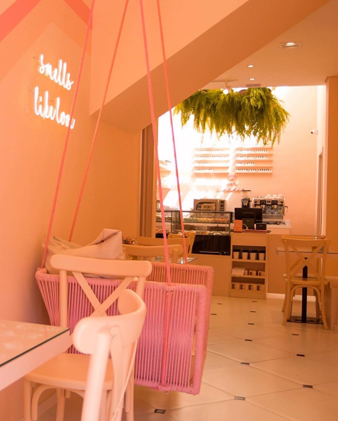 A decoração é repleta de espaços feitos justamente para que os clientes façam uma parada estratégica para as fotos, com cenografia toda pintada em cor de rosa #óbvio, neons e até balanço.