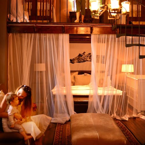As girafas invadem as janelas enquanto os visitantes estão tomando o café da manhã, em busca de uns cafunés e alguns snacks. É proibido dar qualquer alimento que não seja a ração específica à base de grama fornecida pelo hotel. Ao lado de fora, no fim da tarde quando elas costumam também passar por lá antes de voltar pra floresta, é possível ver o pôr-do-sol e recebê-las enquanto toma seu chá da tarde nas mesinhas do jardim. Também é possível vê-las da janela de alguns quartos, já que facilmente elas alcançam os dormitórios, que ficam localizados na parte superior e outros também de frente para o deck do jardim.