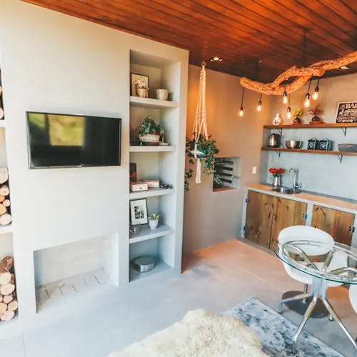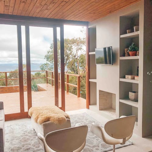 O espaço comporta 2 hóspedes, tem deck com fogo de chão e vista para o pôr do sol do Mirante da Boa Vista, sala com lareira e smart tv, churrasqueira interna, jacuzzi no quarto, trilhas ao redor, contato com animais da região e ainda cachoeira.