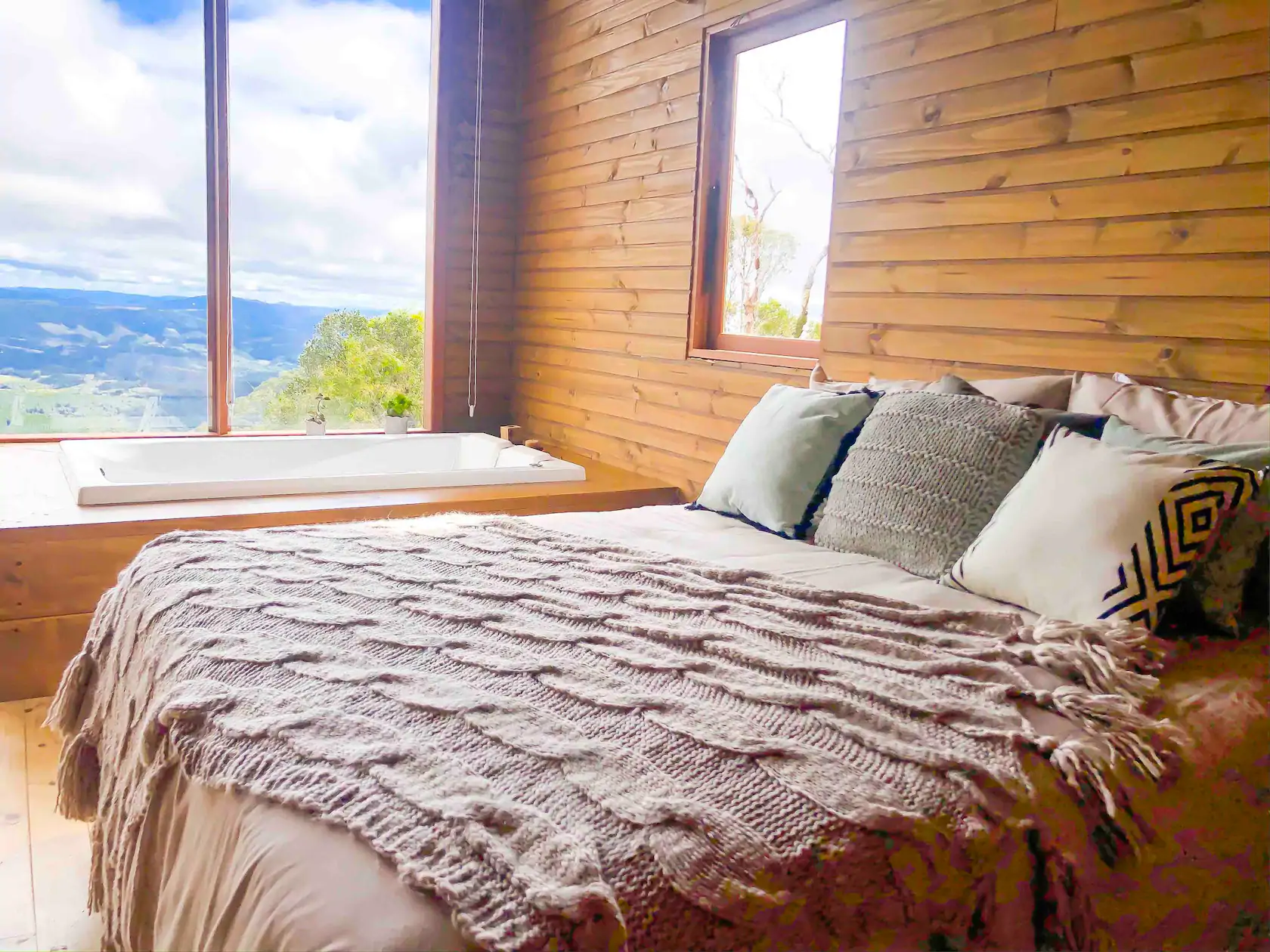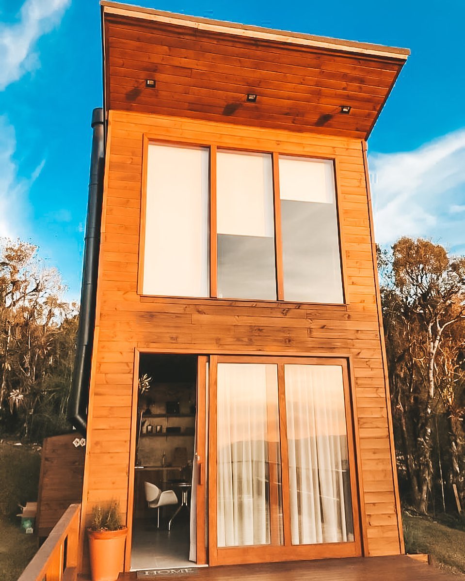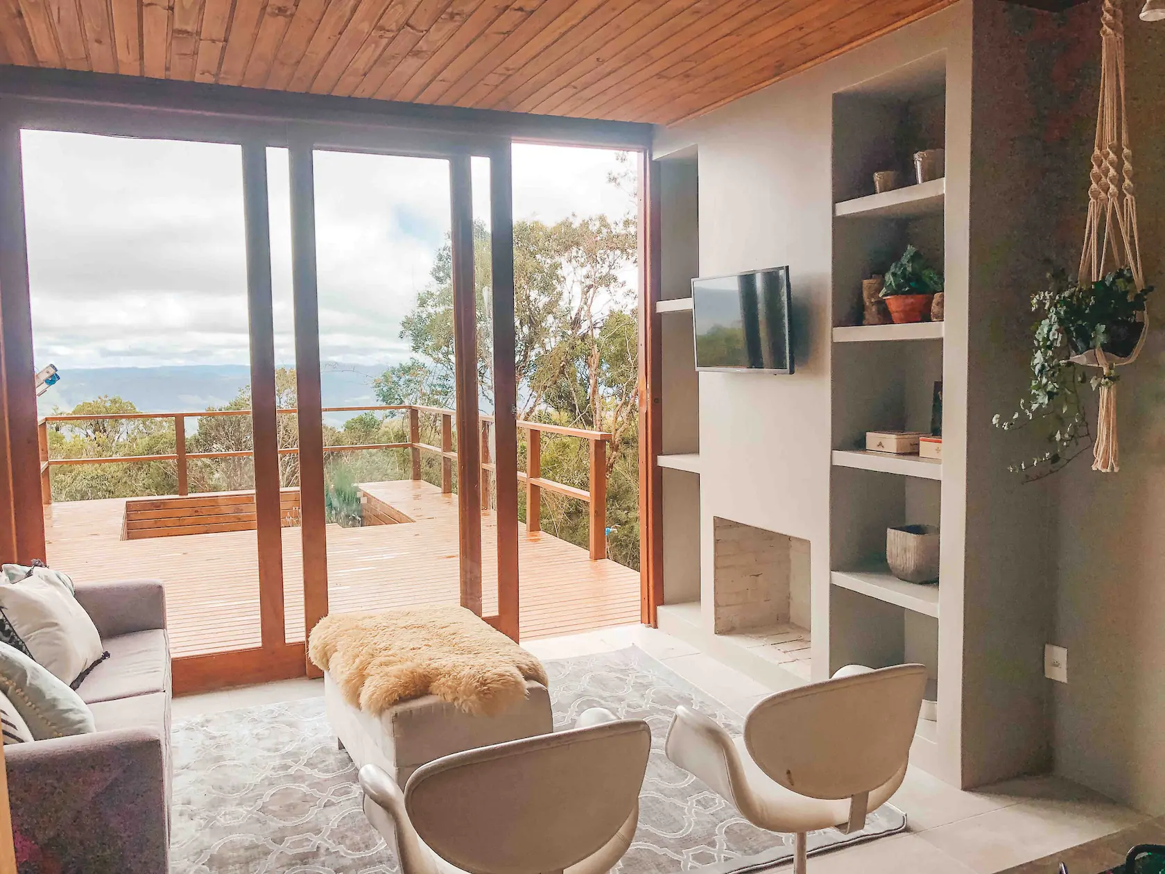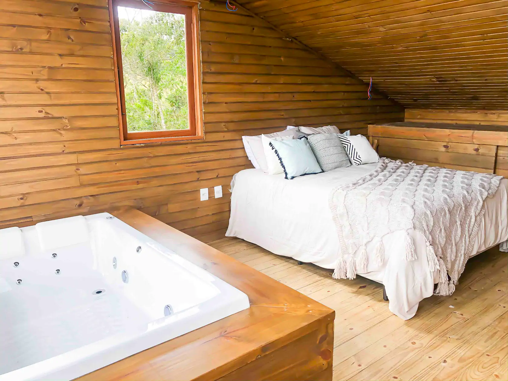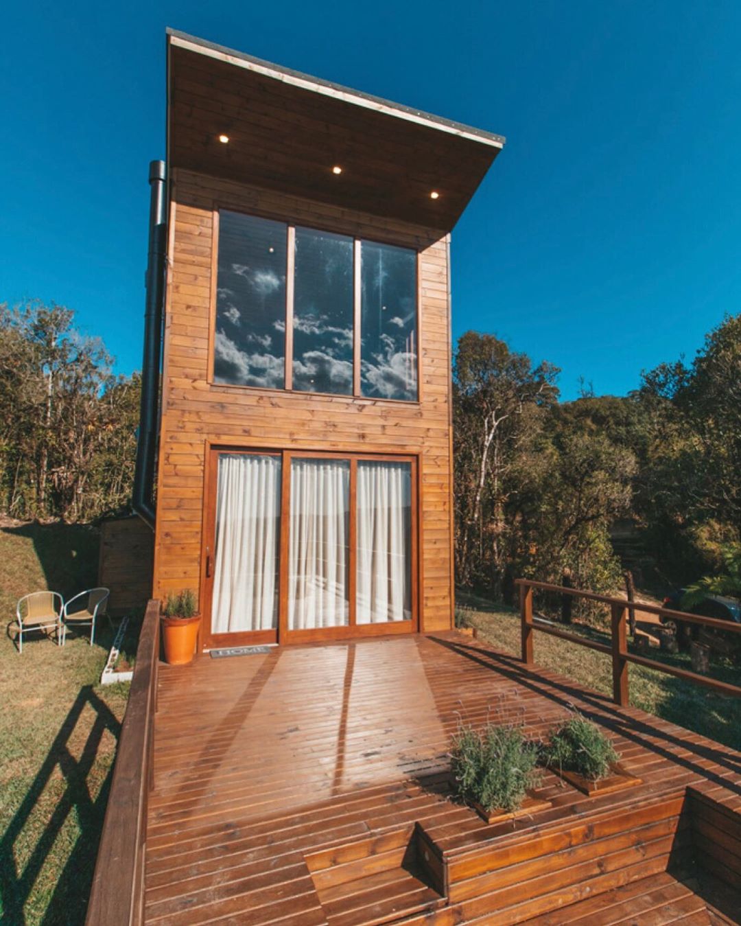 O espaço comporta 2 hóspedes, tem deck com fogo de chão e vista para o pôr do sol do Mirante da Boa Vista, sala com lareira e smart tv, churrasqueira interna, jacuzzi no quarto, trilhas ao redor, contato com animais da região e ainda cachoeira.