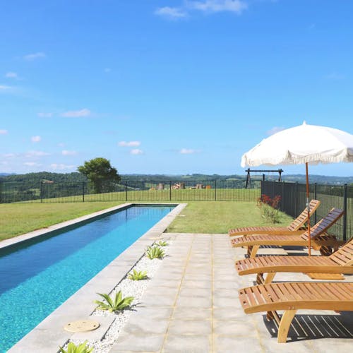 Há uma cozinha completa para grupos grandes, sala de estar em plano aberto e o lounge se abre para um deck amplo com um sofá-cama suspenso. Um banco de 6 metros tem vista para a área de recreação infantil e para a horta.