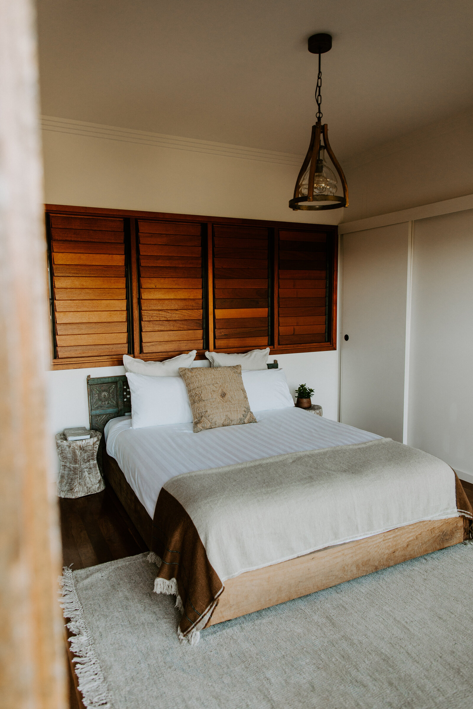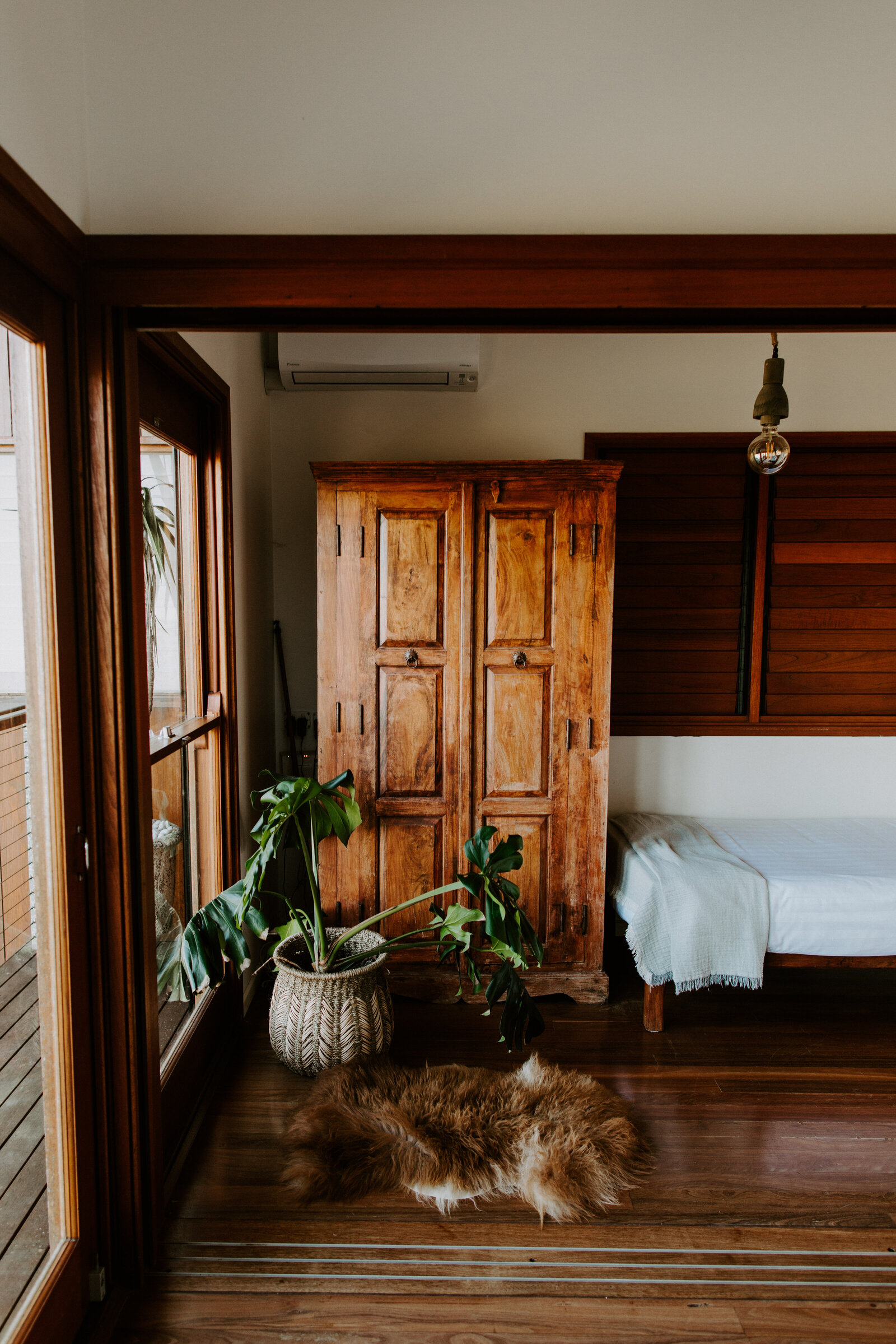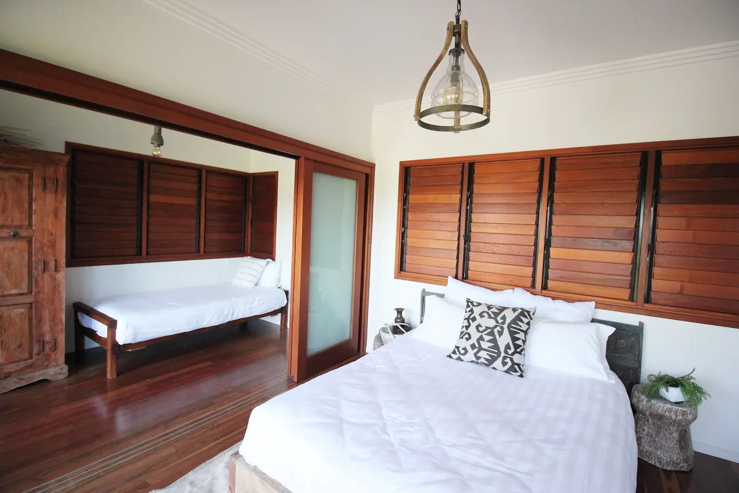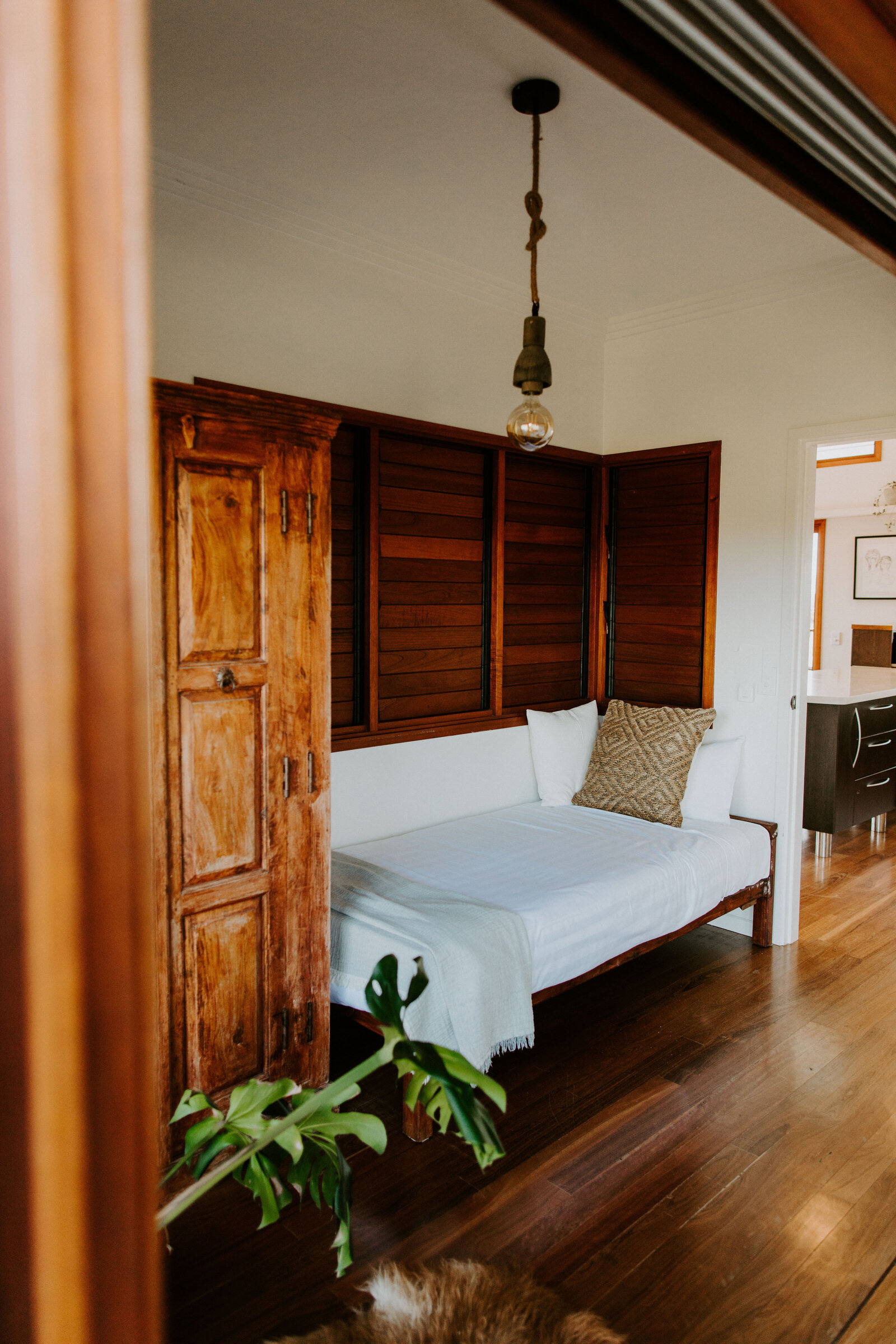 O nível superior tem 4 quartos muito bem decorados no estilo boho.