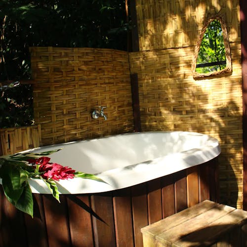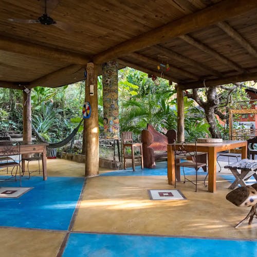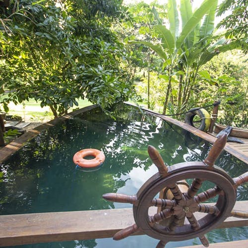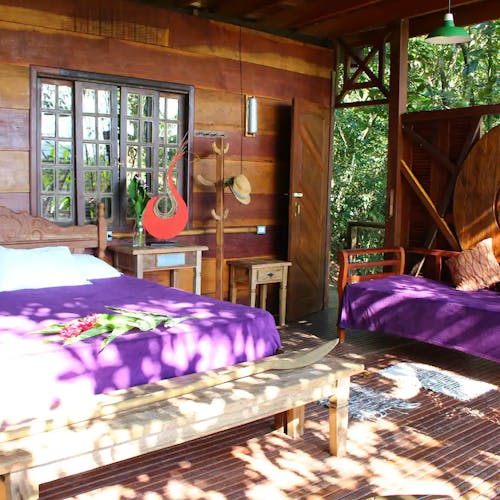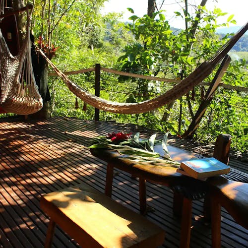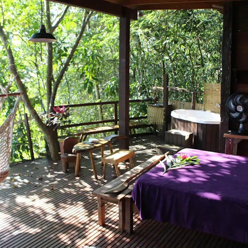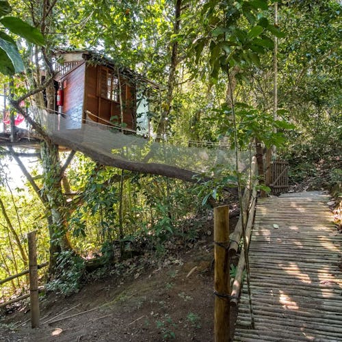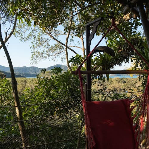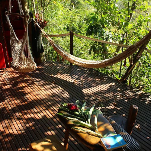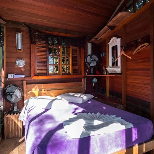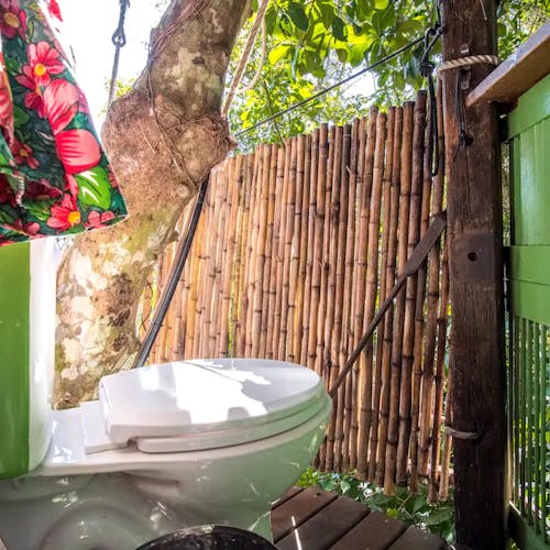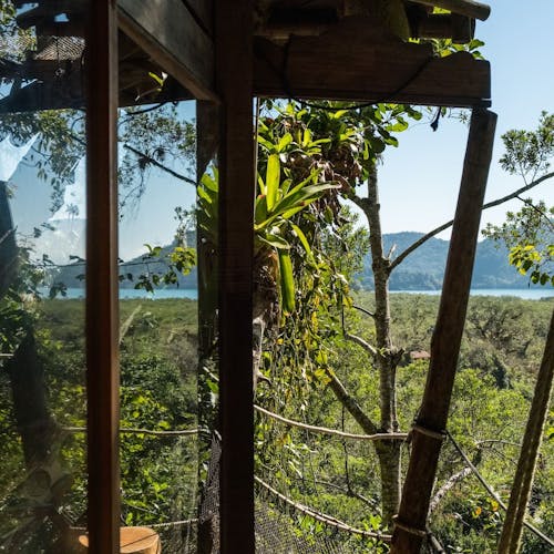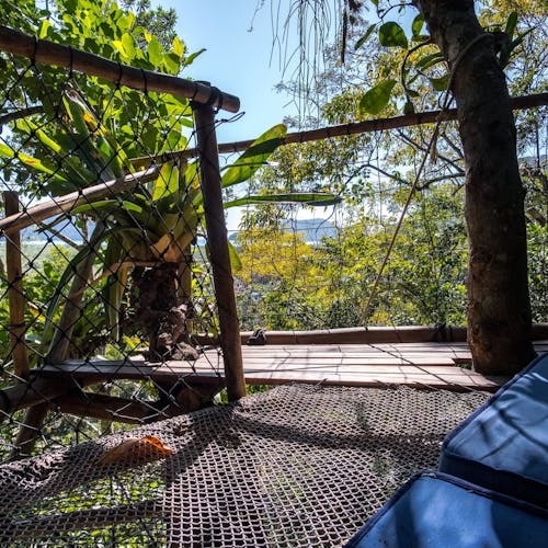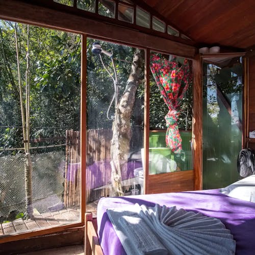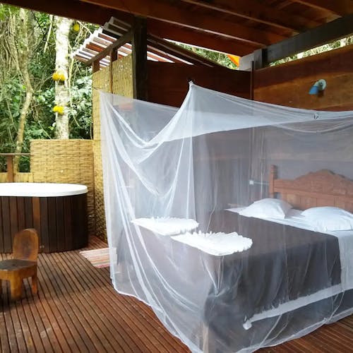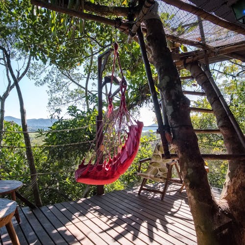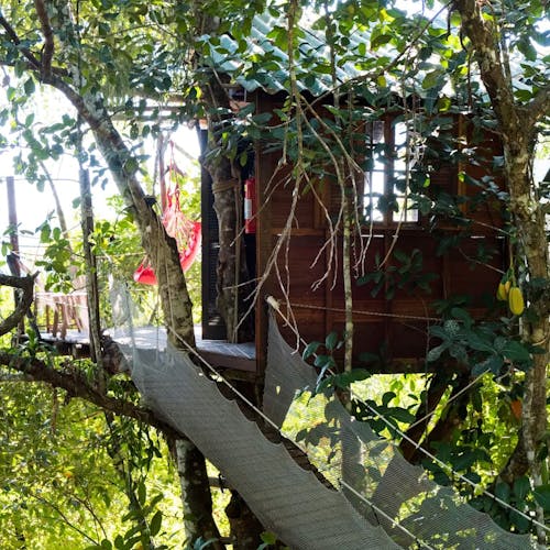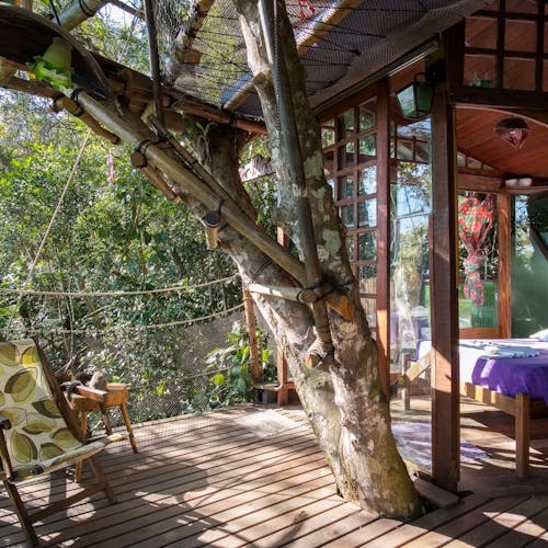 O sonho virou realidade! Essa casa na árvore é totalmente ecológica, construída 100% em cima de uma antiga jaqueira, não foi utilizado nenhum prego na árvore nem cimento! Por estar na copa das árvores na mata atlântica, é muito fresca e é um ótimo mirante com vista do mar de Paraty-Mirim, além de se avistar muitos pássaros e animais. Essa suite é ótima para casais de qualquer idade que apreciem um contato profundo com a natureza. O acesso é facilitado através de uma rampa para as trilhas e área comum.