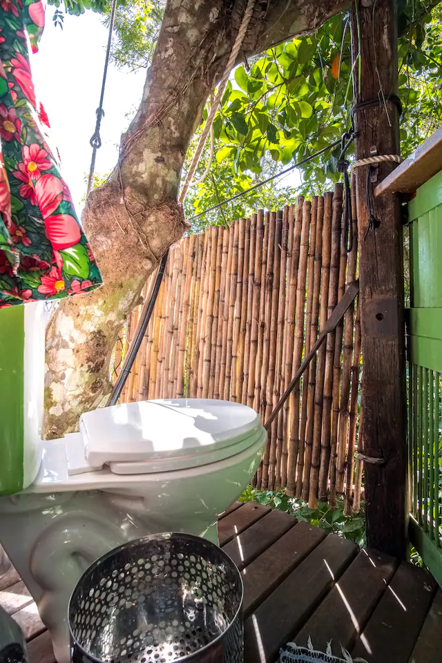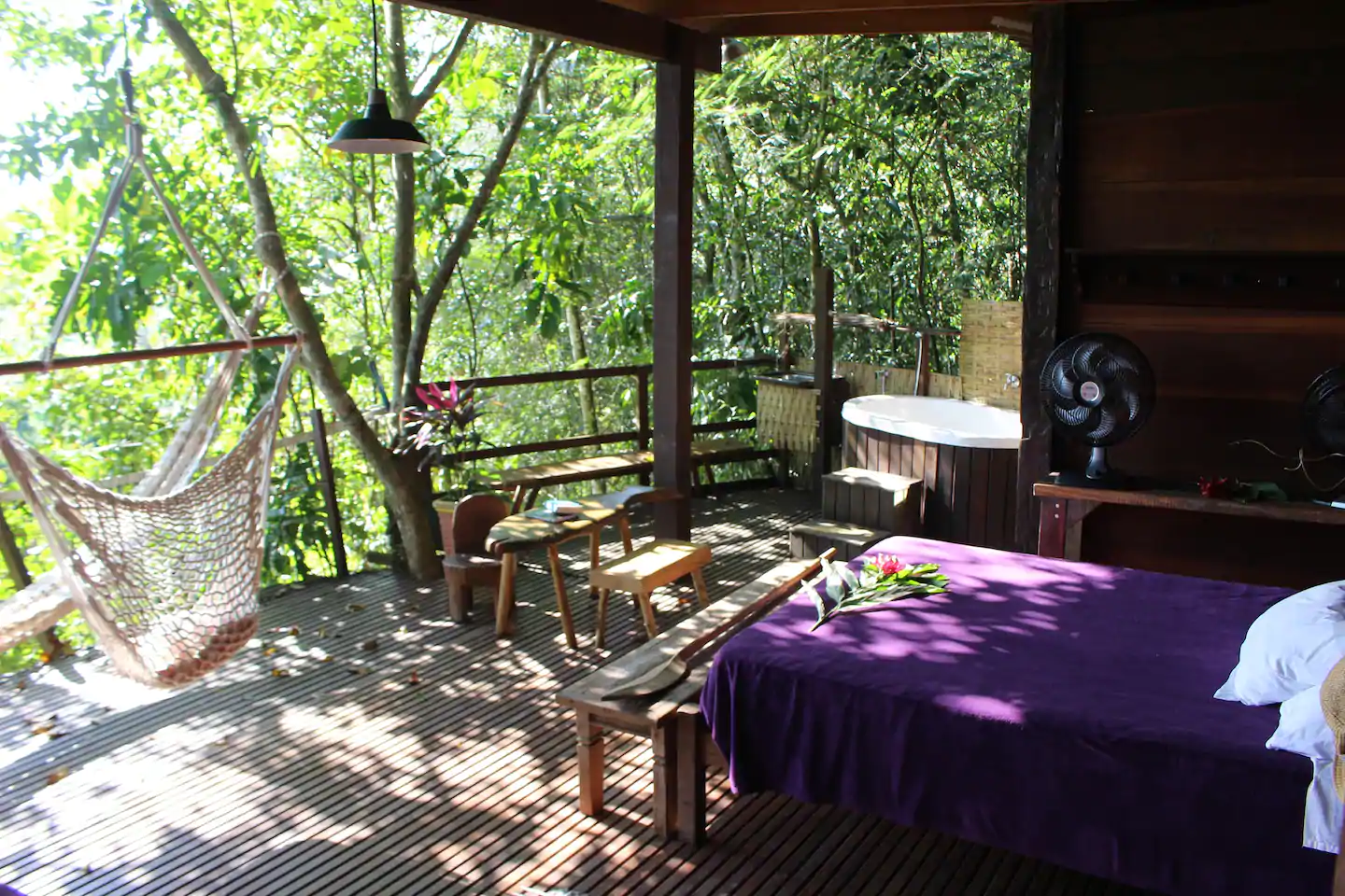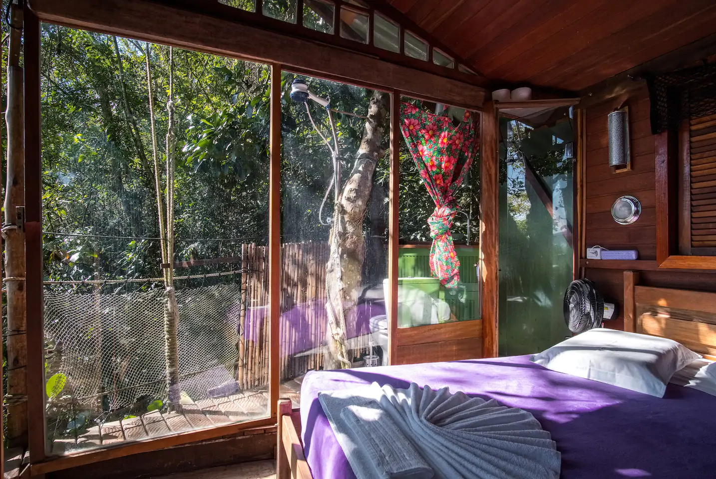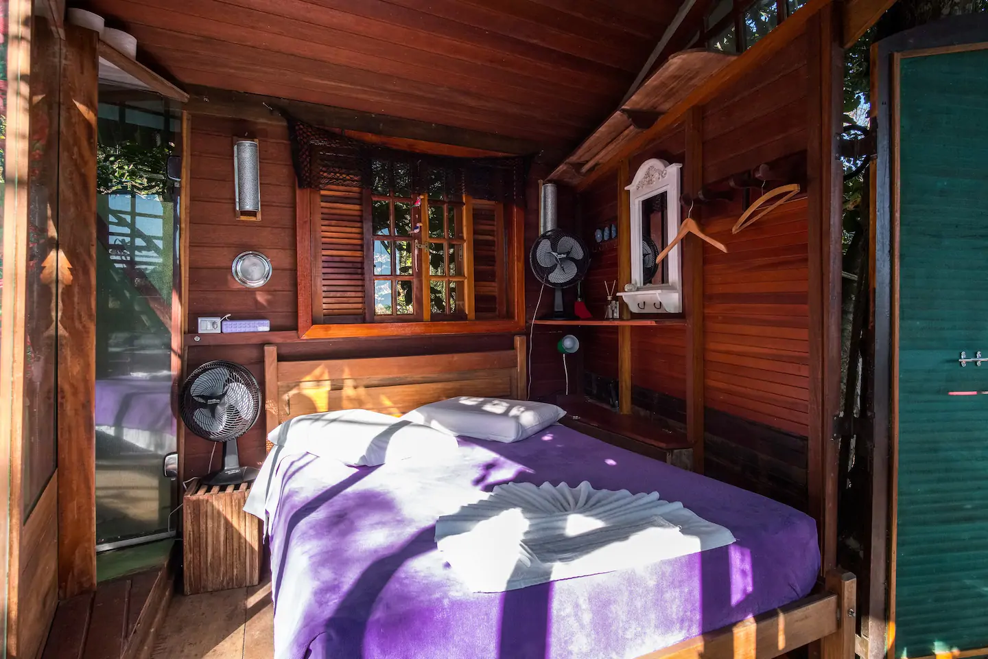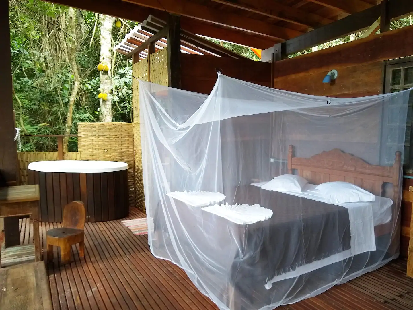 O sonho virou realidade! Essa casa na árvore é totalmente ecológica, construída 100% em cima de uma antiga jaqueira, não foi utilizado nenhum prego na árvore nem cimento! Por estar na copa das árvores na mata atlântica, é muito fresca e é um ótimo mirante com vista do mar de Paraty-Mirim, além de se avistar muitos pássaros e animais. Essa suite é ótima para casais de qualquer idade que apreciem um contato profundo com a natureza. O acesso é facilitado através de uma rampa para as trilhas e área comum.