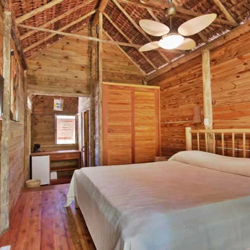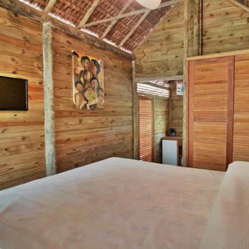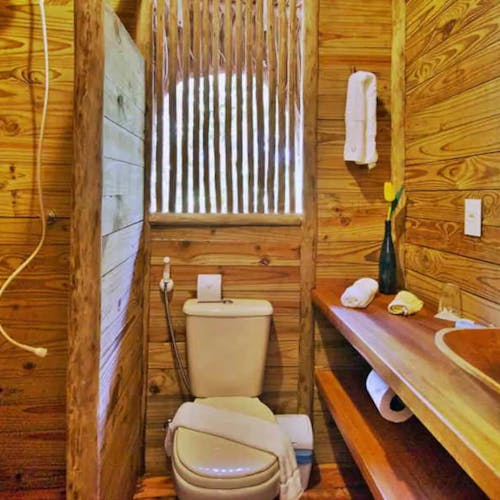 As casa na árvore é cercada naturalmente pela floresta, suspensa 4 metros acima do solo. Ela é construída exclusivamente com madeira: portas, janelas sem vidro, paredes, pisos, chuveiro, lavabo, exceto o sanitário. O telhado é coberto com piaçava. O espaço é bastante arejado e por estar em plena floresta tropical oferece aos hóspedes uma sensação maior de conforto e bem-estar.