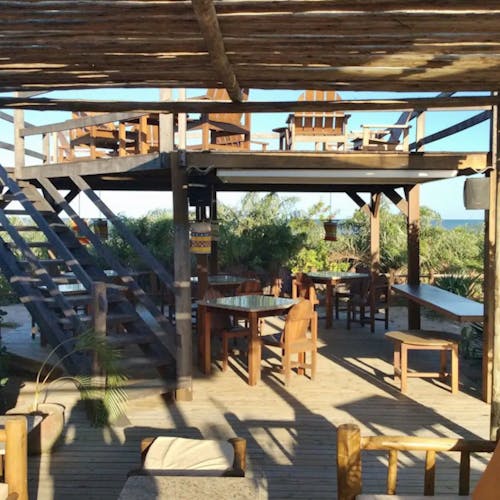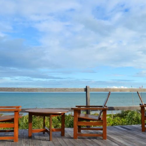 Uma passarela de madeira de 12 metros de comprimento leva através das copas das árvores para um mirante privado dessa hospedagem, equipado com rede, mesa e duas cadeiras. Ali você pode desfrutar a vista deslumbrante sobre o Atlântico Sul.