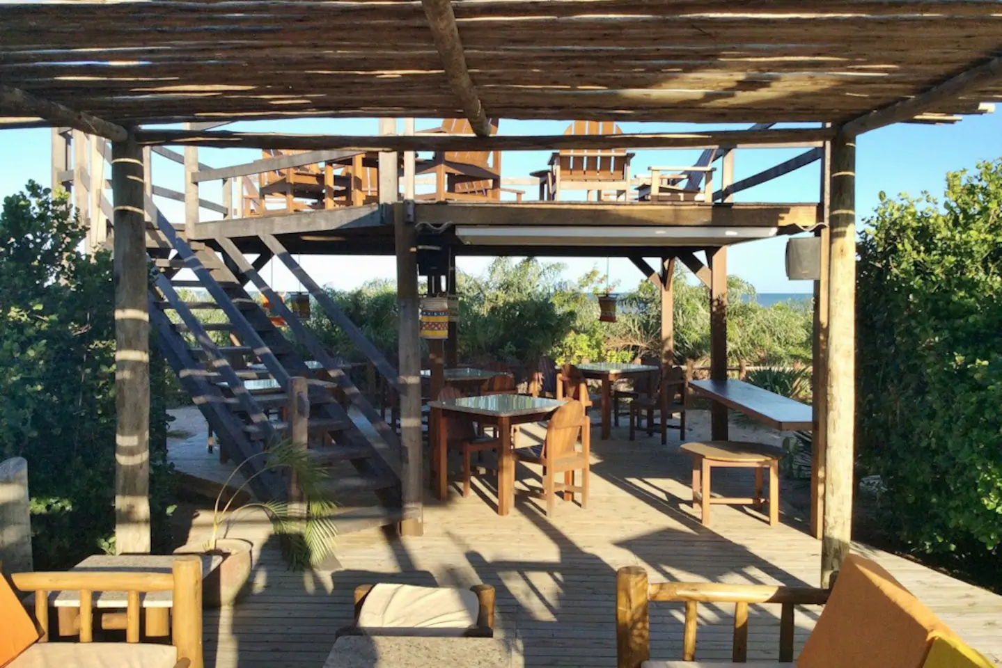 Uma passarela de madeira de 12 metros de comprimento leva através das copas das árvores para um mirante privado dessa hospedagem, equipado com rede, mesa e duas cadeiras. Ali você pode desfrutar a vista deslumbrante sobre o Atlântico Sul.