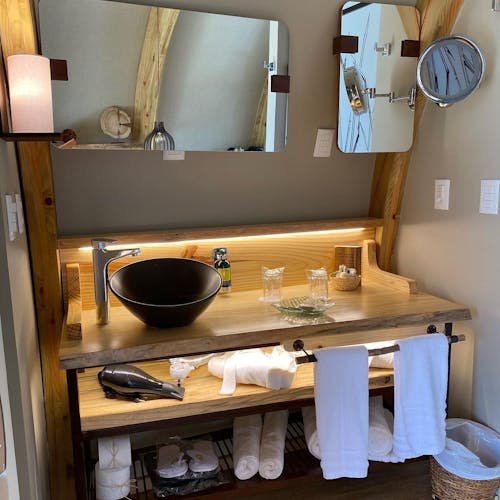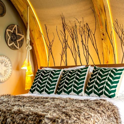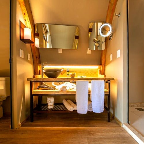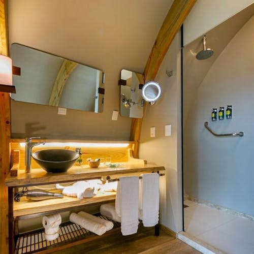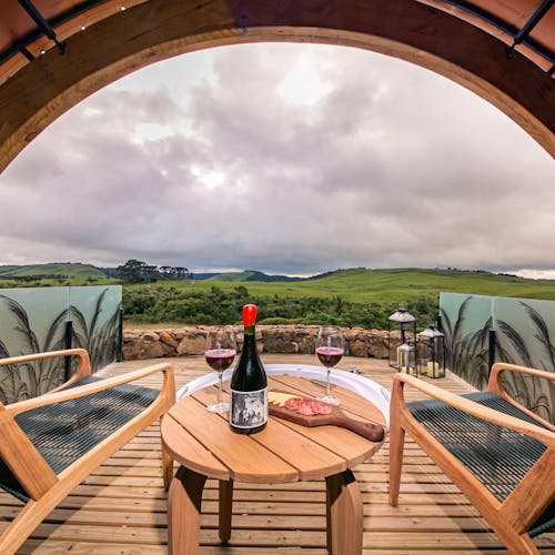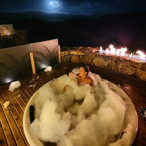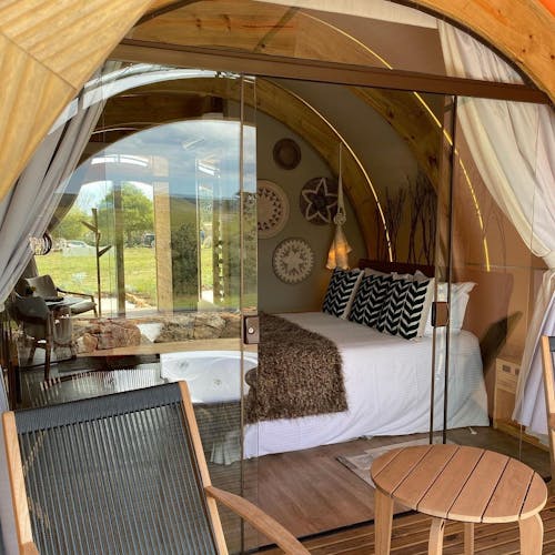 Lençóis térmicos, café da manhã incluso e banheiro privativo com itens de banho L'Occitane, proporcionam comodidade e conforto durante a hospedagem - o banheiro é dentro da própria cabana, diferente de algumas hospedagens no estilo glamping, onde às vezes o banheiro é externo. Há um deck privativo com hidromassagem, fogueira e vista para o campo.