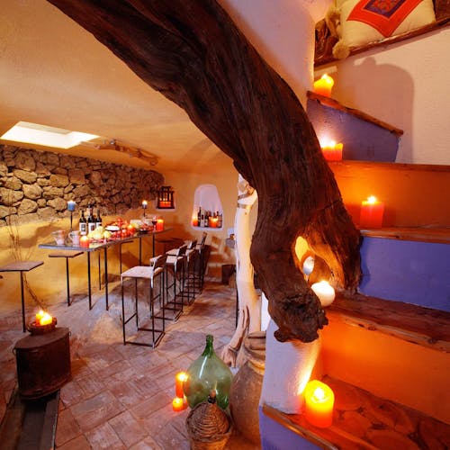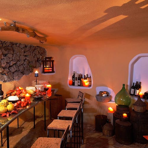 - 🍷 Cave de vinhos: Na Vineria do hotel, uma mesa de 12 lugares sob medida, criada para as sessões de degustação de vinhos, e também ideal para uma reserva particular espera pelos hóspedes. Tudo ali é feito e decorado com materiais do passado, desde as ferramentas da adega ao piso de terracota, passando pelas vigas de zimbro