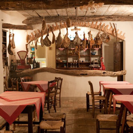 - 🍕. Corte de Su Re: Pisos de tijolos e colunas de pedra datam o século XVII nesse ambiente onde as mesas de madeira são adornadas com cestos típicos da Sardenha, há cores vibrantes em ferro esmaltado. O hóspede é recebido por um vinho local, acompanhado por especialidades à base de amêndoas. O caminho até ali é marcado por velas e samambaias, tornando-o um ambiente exclusivo e convidativo: do forno de barro e lenha onde as senhoras Barbagia preparam o pão e a massa até à grelha onde se cozinham carnes seguindo a tradição. Artefatos tradicionais são vistos ao lado de grupos de dança ou canto de Tenores em um show particular.