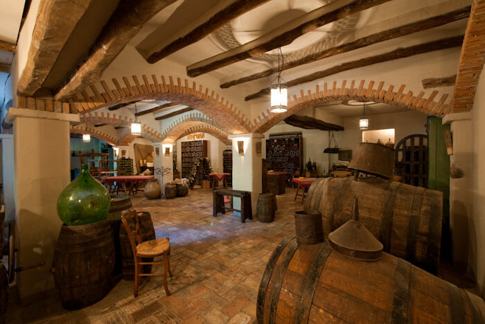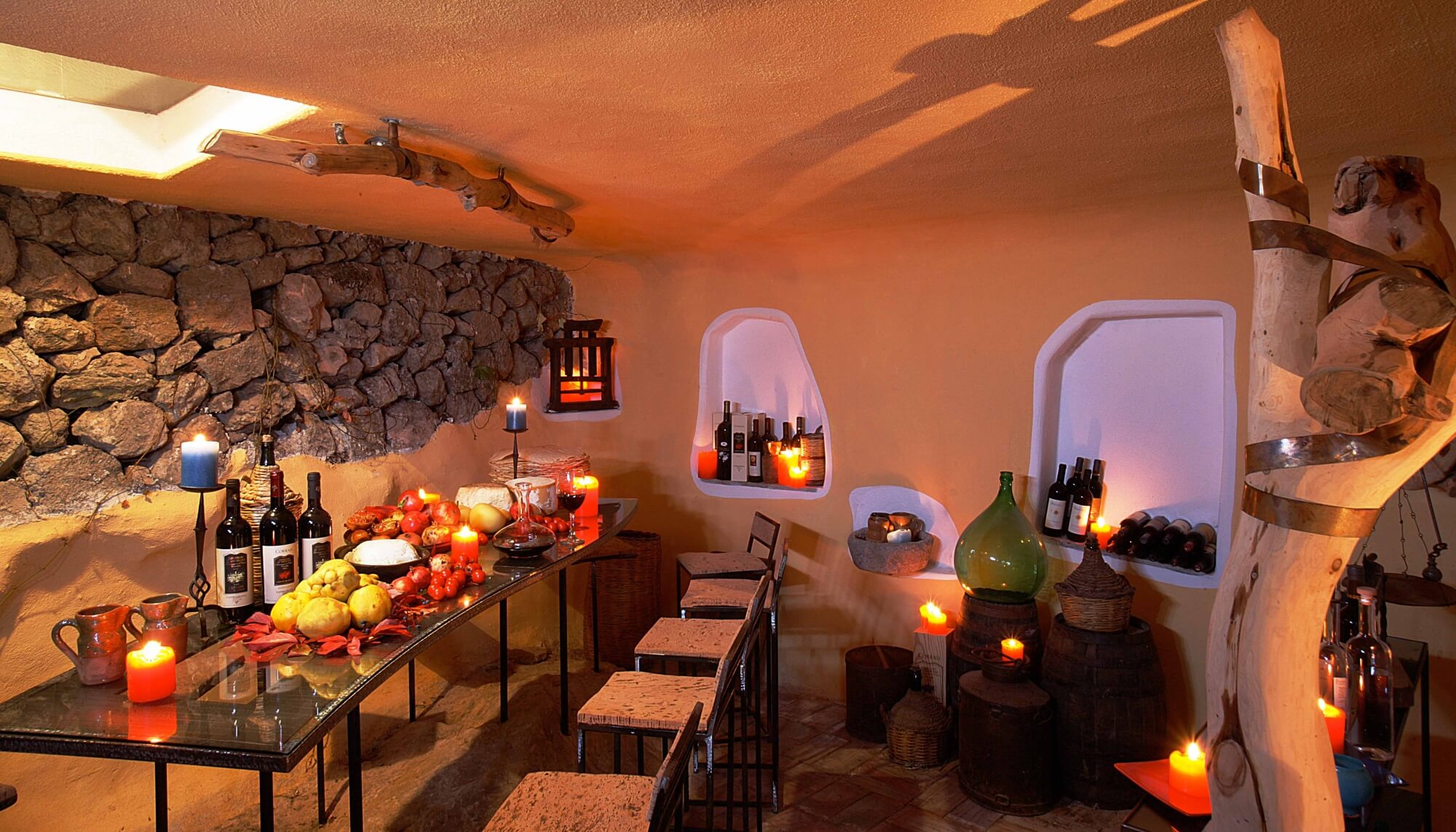 - 🍷 Cave de vinhos: Na Vineria do hotel, uma mesa de 12 lugares sob medida, criada para as sessões de degustação de vinhos, e também ideal para uma reserva particular espera pelos hóspedes. Tudo ali é feito e decorado com materiais do passado, desde as ferramentas da adega ao piso de terracota, passando pelas vigas de zimbro
