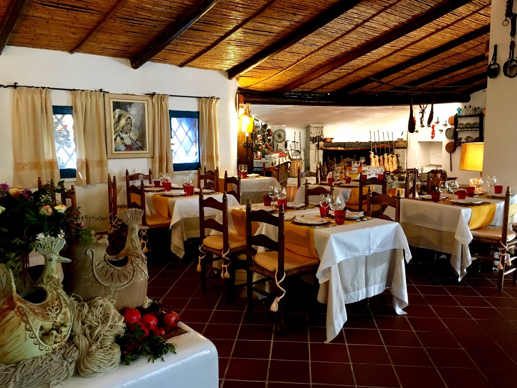 - 🍕. Corte de Su Re: Pisos de tijolos e colunas de pedra datam o século XVII nesse ambiente onde as mesas de madeira são adornadas com cestos típicos da Sardenha, há cores vibrantes em ferro esmaltado. O hóspede é recebido por um vinho local, acompanhado por especialidades à base de amêndoas. O caminho até ali é marcado por velas e samambaias, tornando-o um ambiente exclusivo e convidativo: do forno de barro e lenha onde as senhoras Barbagia preparam o pão e a massa até à grelha onde se cozinham carnes seguindo a tradição. Artefatos tradicionais são vistos ao lado de grupos de dança ou canto de Tenores em um show particular.