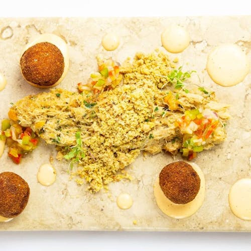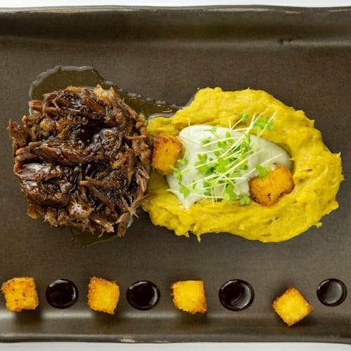 - 🍖 rabada desfiada, purê de banana e emulsão de gorgonzola, polenta frita e broto de agrião