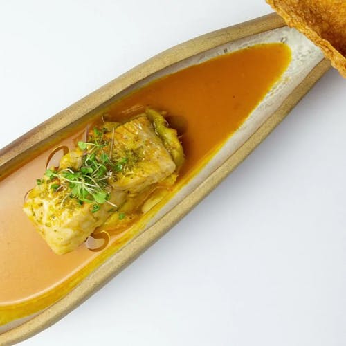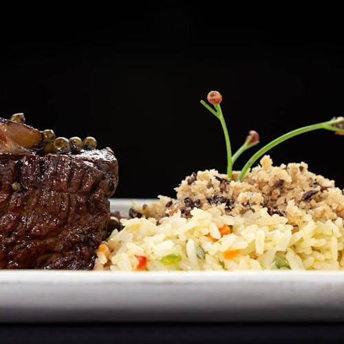 - 🐟 lombo de peixe selado, com manteiga de alho, ervas e tucupi preto sobre arroz com banana assada e ninho de cebolas fritas