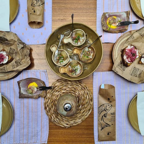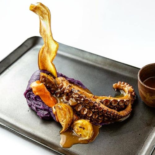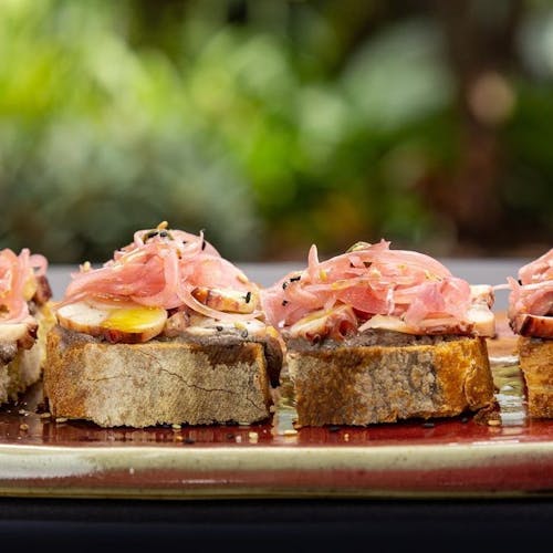- 🐙 polvo em lâminas sobre tapenade e picles de cebola roxa picante sobre pão