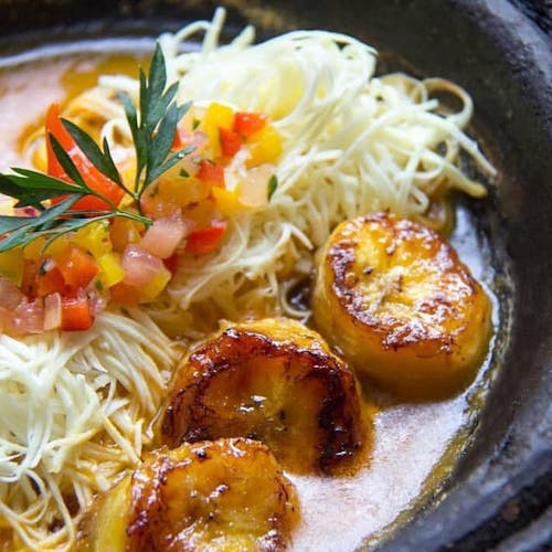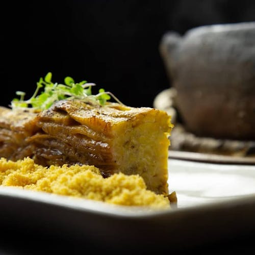 - 🍌 moqueca de banana da terra, palmito e pimenta de bico, com farofa da terra