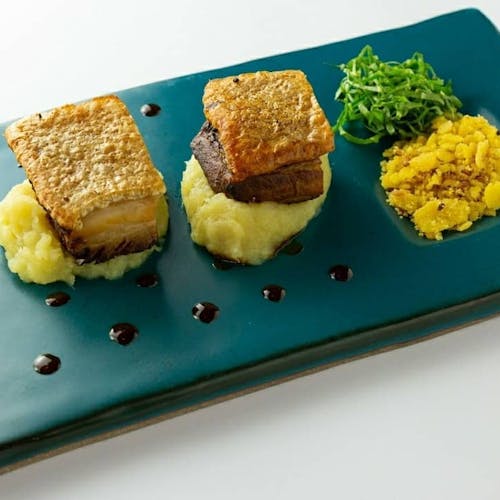 - 🐷 barriga de porco pururuca, pure de abacaxi, molho de porco, farofa de farinha de milho e couve