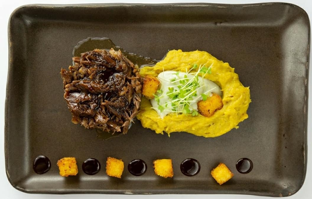 - 🍖 rabada desfiada, purê de banana e emulsão de gorgonzola, polenta frita e broto de agrião