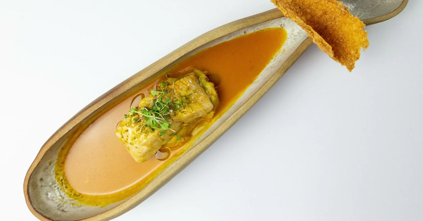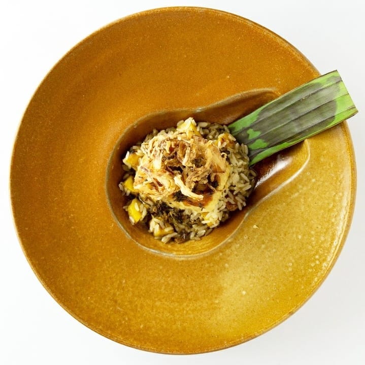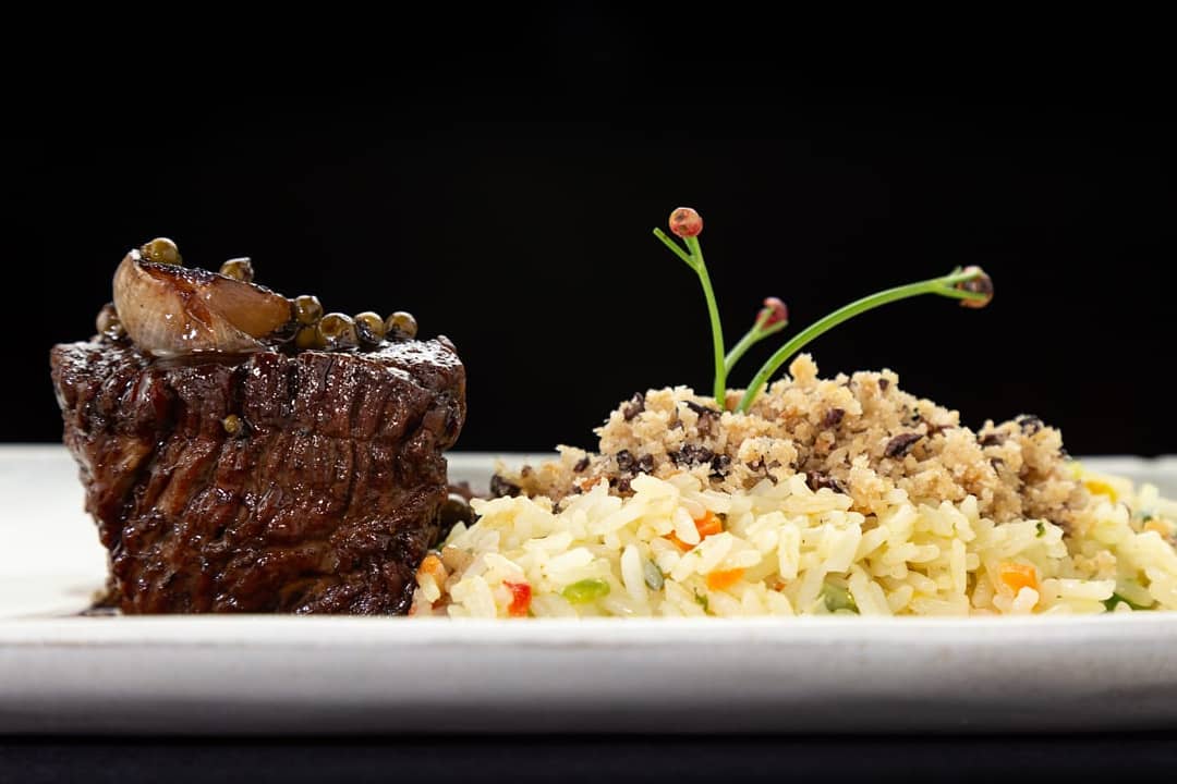 - 🐟 lombo de peixe selado, com manteiga de alho, ervas e tucupi preto sobre arroz com banana assada e ninho de cebolas fritas